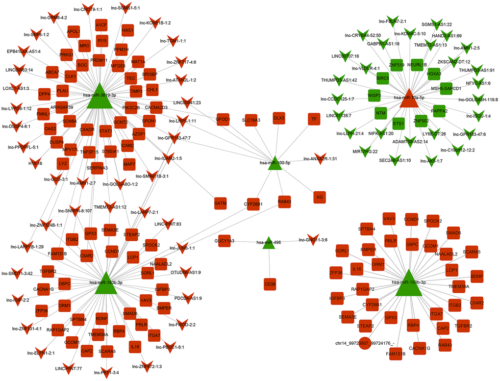 We also constructed the network regulatory interactions across coding and noncoding RNAs triggered by miR-10a-5p. Considering that miRNAs play critical pivotal roles in ceRNA interactions, we constructed ceRNA regulatory networks centralized on significant upregulated and downregulated miRNAs. Downregulated miRNAs-associated ceRNA networks contained 1 circRNA, 42 lncRNA, 5 miRNA and 112 mRNA (Figure 10). Especially, miR-10a-5p was the only upregulated miRNA after miR-10a-5p overexpression. The ceRNA network centered on miR-10a-5p consisted of 27 lncRNA, 1 miRNA, and 10 mRNA (Figure 10). The complicated regulatory networks across coding and noncoding RNAs revealed the powerful regulating effects of miR-10a-5p.