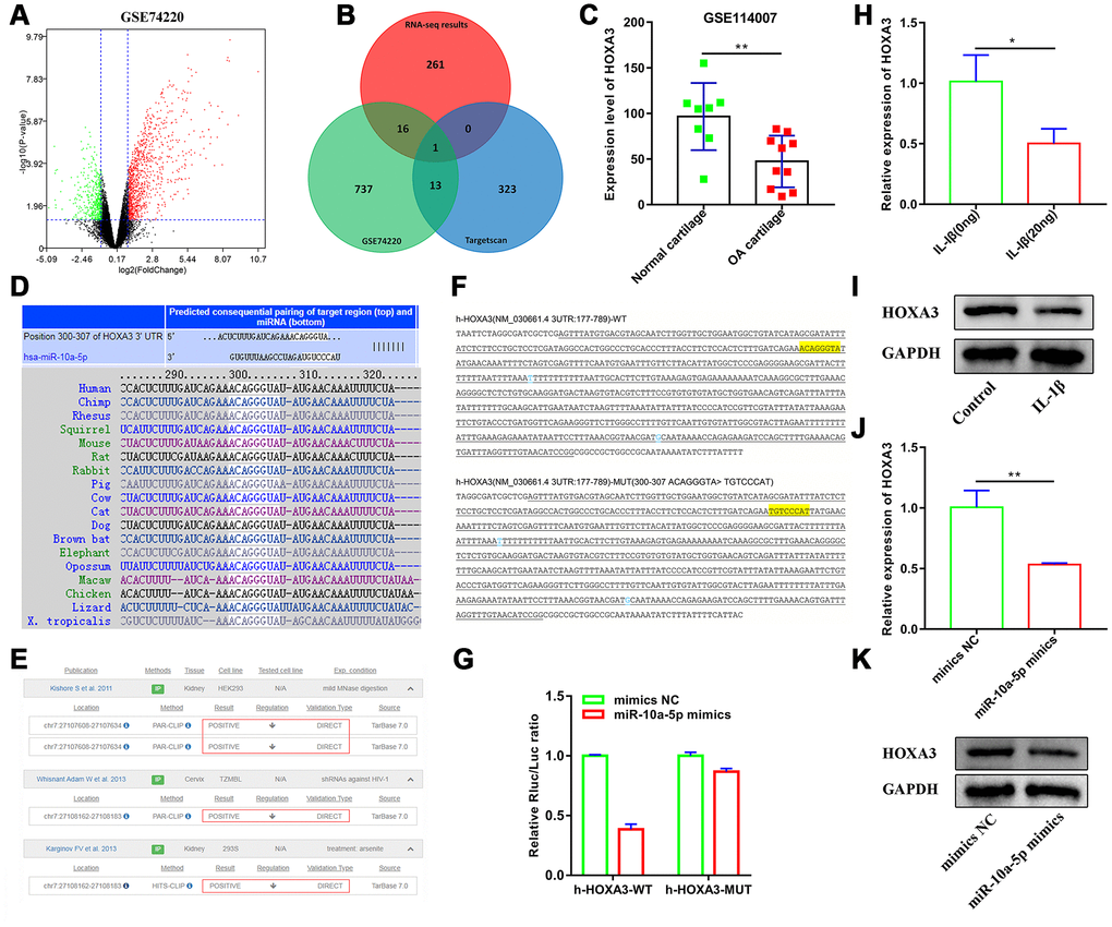 To seek for the potential target of miR-10a-5p, we firstly identify the downregulated mRNAs in OA. A total of 767 downregulated mRNAs were identified in IL-1β induced primary chondrocytes after processing the data of GSE74220 using BioJupies [31] (Figure 10A). Furthermore, we investigated that HOXA3 was the only overlapping mRNA across the downregulated mRNAs in GSE74220, the predicted targets of miR-10a-5p via Targetscan, and the downregulated mRNAs in our RNA-seq results (Figure 11B). Subsequently, we found that HOXA3 was downregulated in OA cartilage after analyzing the results of GSE114007 (Figure 11C). The results of Targetscan showed that the seed region of miR-10a-5p was well-paired with 3’UTR of HOXA3, which was conservative among vertebrates (Figure 11D). According to TarBase v.8 [32], high-throughput experiments including PAR-CLIP and HITS-CLIP indicated that miR-10a-5p was the direct inhibition to HOXA3 in HEK293, TZMBL, and 293S (Figure 11E). Furthermore, dual luciferase reporter assay confirmed that luciferase activity of HOXA3-wt was obviously inhibited by miR-10a-5p mimics as compared with that in HOXA3-mut group (Figure 11F–11G). RT-qPCR and western blot results showed that HOXA3 was significantly inhibited in IL-1β induced HC-a (Figure 11H–11I) and miR-10a-5p overexpression (Figure 11J–11K). Taken together, these results indicated that HOXA3 was downregulated in OA and acted as the targeted genes of miR-10a-5p.