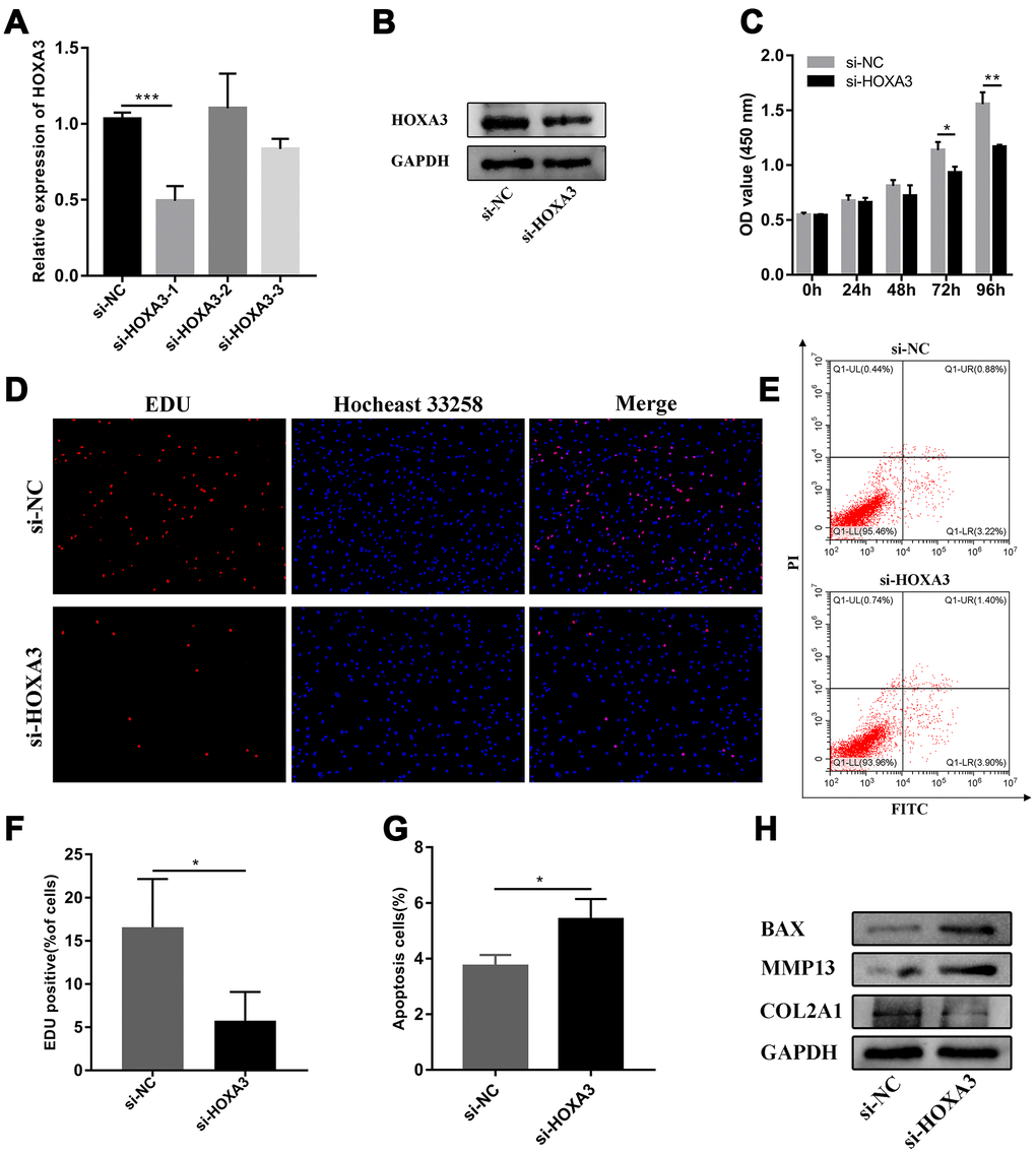 The total protein of cells was extracted using RIPA buffer (Solarbio Biotech, Beijing, China). Protein concentrations were examined using BCATM protein assay kit (Beyotime Biotechnology, Shanghai, China). A total of 30ug protein was loaded onto the PAGE (EpiZyme, Shanghai, China), separated by electrophoresis and then transferred onto PVDF membranes (Immunoblot, Bio-Rad). The membranes were blocked with 5% non-fat milk (Difco™ Skim Milk, BD) for 1 h at room temperature and incubated with primary antibodies against COL2A1 (Proteintech, Wuhan, China), MMP13(Santa Cruz, UK), BAX(CST, USA), HOXA3(Santa Cruz, USA), GAPDH(CST, USA) at 4 °C overnight. Next, the membranes were incubated with secondary antibodies(Santa Cruz, USA) for 1 h at room temperature. The protein signaling were visualized with ECL chemiluminescence kit(Santa Cruz Biotechnology, Dallas, TX, USA) using Molecular Imager ChemiDoc XRS System(Bio-Rad).
