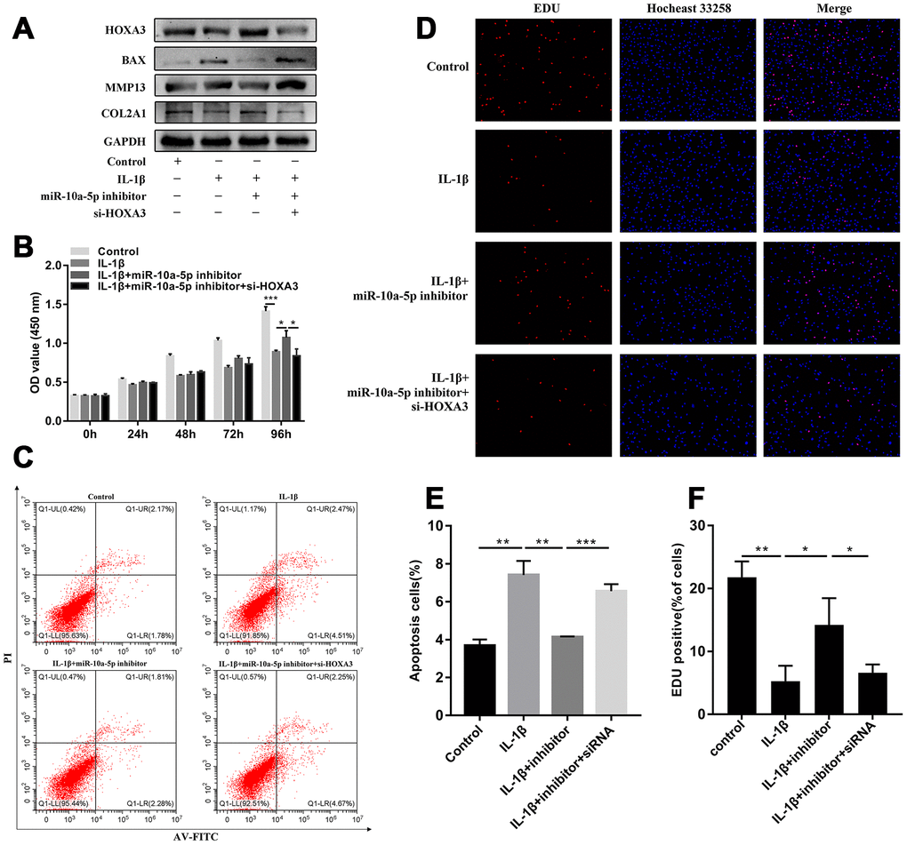 Based on the above results, we found that miR-10a-5p was a significant contributor to the pathogenesis of OA. RNA-sequencing together with integrated bioinformatics analyses identified that miR-10a-5p promoted the progression of OA through triggering the alterations of the whole transcriptome. Subsequently, one of the most representative downstream genes, HOXA3 (the targeted gene of miR-10a-5p) was chosen to verify the predicted mechanisms from bioinformatics analyses. Three siRNAs were designed to knockdown the expression of HOXA3. RT-qPCR results showed that si-HOXA3-1 had the highest silence efficiency, which was further confirmed by western blot (Figure 12A, 12B). Therefore, si-HOXA3-1 was chosen to perform subsequent experiments. CCK-8 assay, EDU assay, flow cytometry assay, and western blot verified that silence of HOXA3 significantly inhibited chondrocyte proliferation (Figure 12C, 12D, 12F), promoted chondrocyte apoptosis (Figure 12E, 12G) and cartilage matrix degradation (Figure 12H). Next, we further investigated whether miR-10a-5p functioned in IL-1β induced HC-a through targeting HOXA3. We treated HC-a with IL-1β and then co-transfected miR-10a-5p inhibitor and si-HOXA3. Western blot also indicated that si-HOXA3 partly reversed the protective effect of miR-10a-5p inhibitor on IL-1β treated HC-a (Figure 13A). CCK-8 and EDU assay indicated that miR-10a-5p inhibitor partly restored IL-1β-induced inhibition of HC-a proliferation, while si-HOXA3 attenuated the effect of miR-10a-5p inhibitor on IL-1β treated HC-a (Figure 13B, 13D, 13F). Flow cytometry assay showed that miR-10a-5p inhibitor partly reversed IL-1β-induced chondrocyte apoptosis, while si-HOXA3 antagonized the effect of miR-10a-5p inhibitor on IL-1β treated chondrocyte (Figure 13C, 13E). Collectively, these finding indicated that miR-10a-5p exerts biological functions in OA cell model by targeting HOXA3.