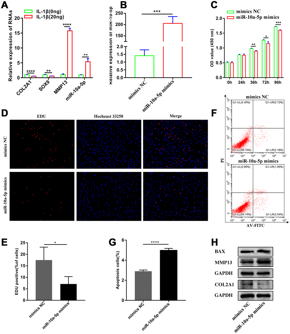 Subsequently, we evaluated the effect of miR-10a-5p on chondrocyte proliferation, apoptosis and metabolism after overexpressing miR-10a-5p in HC-a (Figure 3B). CCK-8 assay, EDU assay, and flow cytometry assay indicated that overexpression of miR-10a-5p inhibited chondrocyte proliferation (Figure 3C–3E) and promoted chondrocyte apoptosis (Figure 3F–3G). Also, we performed western blot to explore the effect of miR-10a-5p on extracellular matrix metabolism. Western blot results indicated that overexpression of miR-10a-5p inhibited the expression of COL2A1 and promoted the expression of MMP13 (Figure 3H). Taken together, these results demonstrated that miR-10a-5p may act as a significant contributing factor for OA.