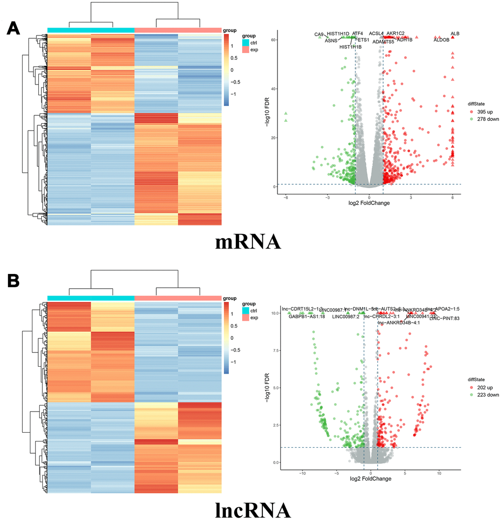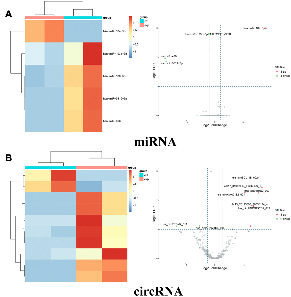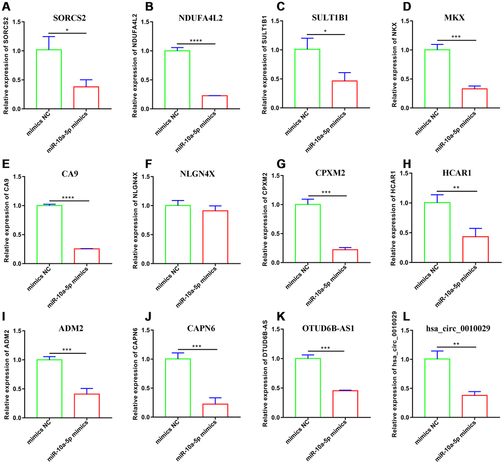 To explore the potential mechanism of miR-10a-5p in OA, we performed the whole transcriptome sequencing to identify differentially-expressed genes on HC-a via miR-10a-5p overexpressing. These results indicated that overexpression of miR-10a-5p induced the alteration of the whole transcriptome, which involved 395 up-regulated and 278 down-regulated mRNAs (Figure 4A), 202 up-regulated and 223 down-regulated lncRNAs (Figure 4B), 1 up-regulated and 4 down-regulated miRNAs (Figure 5A), and 8 up-regulated and 2 down-regulated circRNAs (Figure 5B). The detailed differentially-expressed mRNAs, lncRNAs, miRNAs, and circRNAs were showed in Supplementary Tables 2–5. Moreover, RT-qPCR showed that the expression level of 12 selected differentially-expressed genes were basically consistent with the results of RNA-seq (Figure 6).