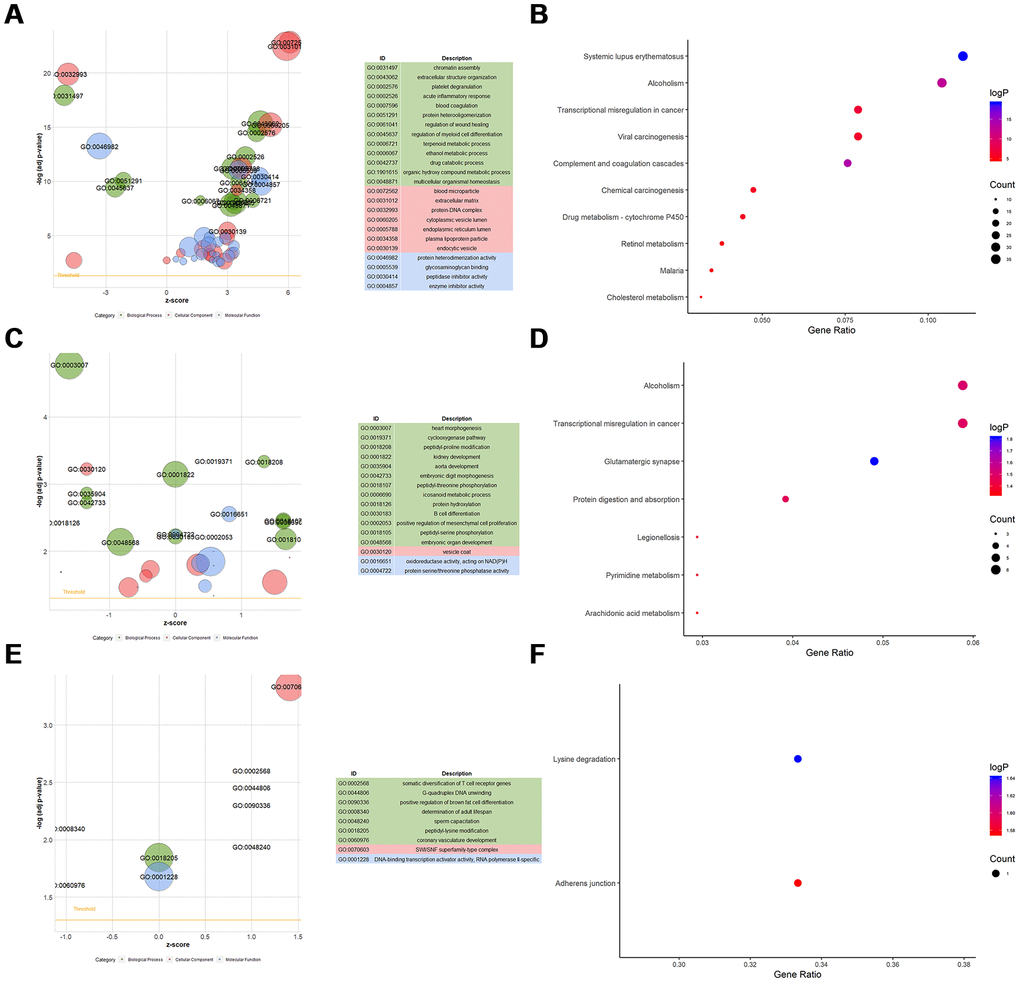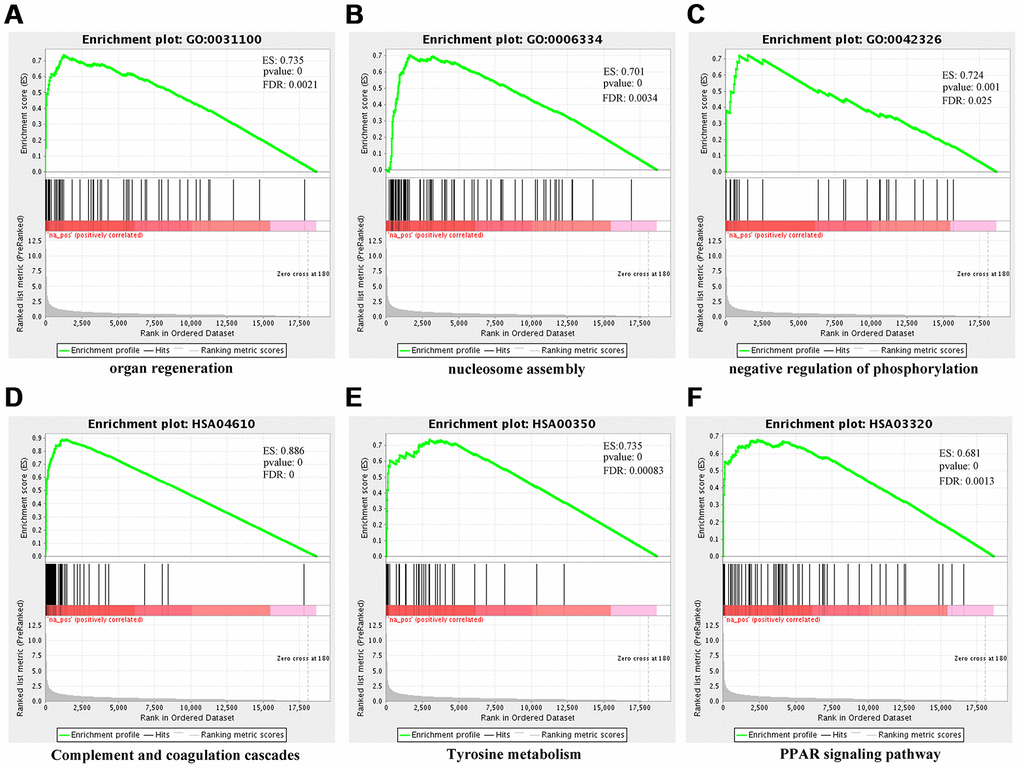 Furthermore, we undertook functional enrichment analyses for these dysregulated genes. GO enrichment analysis for dysfunctional mRNAs indicated that they were mainly enriched in chromatin assembly (GO:0031497), extracellular structure organization (GO:0043062), protein-DNA Complex (GO:0032993), extracellular matrix (GO:0031012), and glycosaminoglycan binding (GO:0005539) (Figure 7A, Supplementary Tables 6–8). KEGG enrichment analysis for dysfunctional mRNAs revealed that they mainly enriched in systemic lupus erythematosus (HSA05322), alcoholism (HSA05034), complement and coagulation cascades (HSA04610), and cholesterol metabolism (HSA04979) (Figure 7B, Supplementary Table 9). Functional enrichment analyses for cis-genes of differentially expressed lncRNAs showed that they were enriched in positive regulation of mesenchymal cell proliferation (GO:0002053), peptidyl-proline modification (GO:0018208), Alcoholism (HSA05034), Arachidonic acid metabolism (HSA00590) (Figure 7C, 7D, Supplementary Tables 10–13). Functional enrichment analyses for parental genes of differentially expressed circRNAs showed that they mainly participated in somatic diversification of T cell receptor genes (GO:0002568), positive regulation of brown fat cell differentiation (GO:0090336), Adherens junction (HSA04520) (Figure 7E, 7F, Supplementary Tables 14–17). Also, GSEA for differentially expressed mRNAs verified that they were mainly associated with organ regeneration (GO:0031100), nucleosome assembly (GO:0006334), negative regulation of phosphorylation (GO:0042326), complement and coagulation cascades (HSA04610), tyrosine metabolism (HSA00350), PPAR signaling pathway (HSA03320), PI3K-Akt signaling pathway (HSA04151), p53 signaling pathway (HSA04115), FoxO signaling pathway (HSA04068) (Figure 8A–8F, Supplementary Tables 18–19).