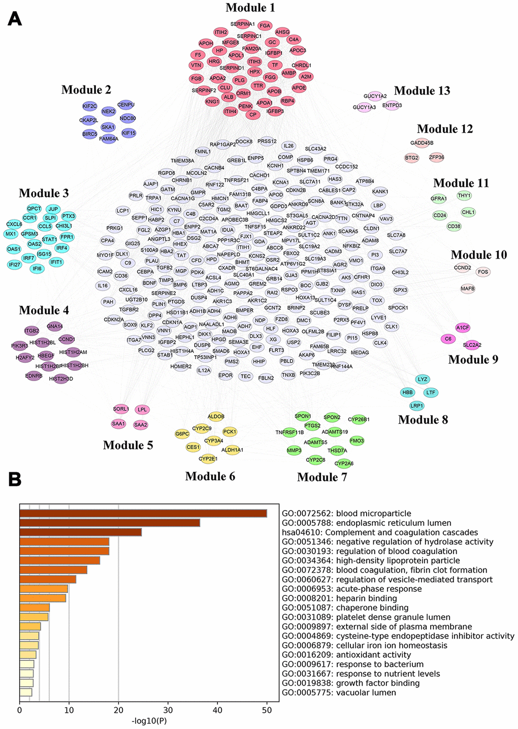 The protein-protein regulatory network contained 365 nodes and 2210 edges (Figure 9A). MCODE analysis indicated that thirteen modules were extract from the PPI network, but the 42 genes from module 1 had the highest node degree according to CytoHubba (Supplementary Table 20). Therefore, these genes from module 1 were identified as hub genes. Subsequently, we conducted functional enrichment analyses for these hub genes using Metascape [30]. The results revealed that they were mainly enriched in blood microparticle (GO:0072562), endoplasmic reticulum lumen (GO:0005788), complement and coagulation cascades (HSA04610) (Figure 9B).