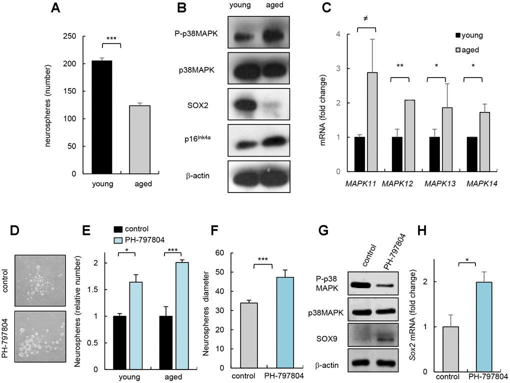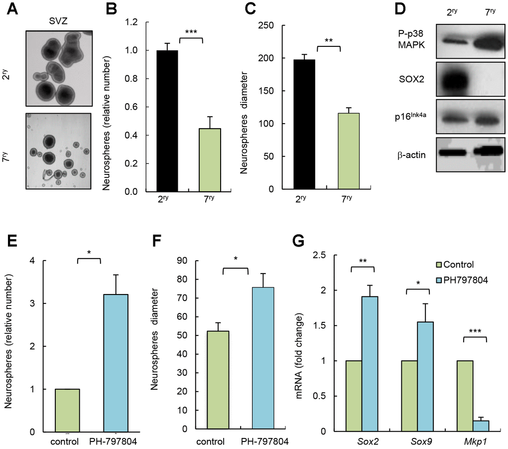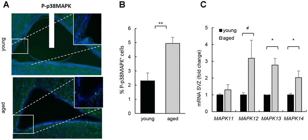 In summary, we show that p38MAPK activity is elevated in SVZ neurogenic niche of aged mice in vivo and in neurospheres derived from aged cells in vitro. Moreover, pharmacological inhibition of p38MAPK in aged neurospheres rejuvenates NSC/progenitor activity in vitro. Ultimately, our data postulate p38MAPK activity as an intrinsic regulator of NSC aging.