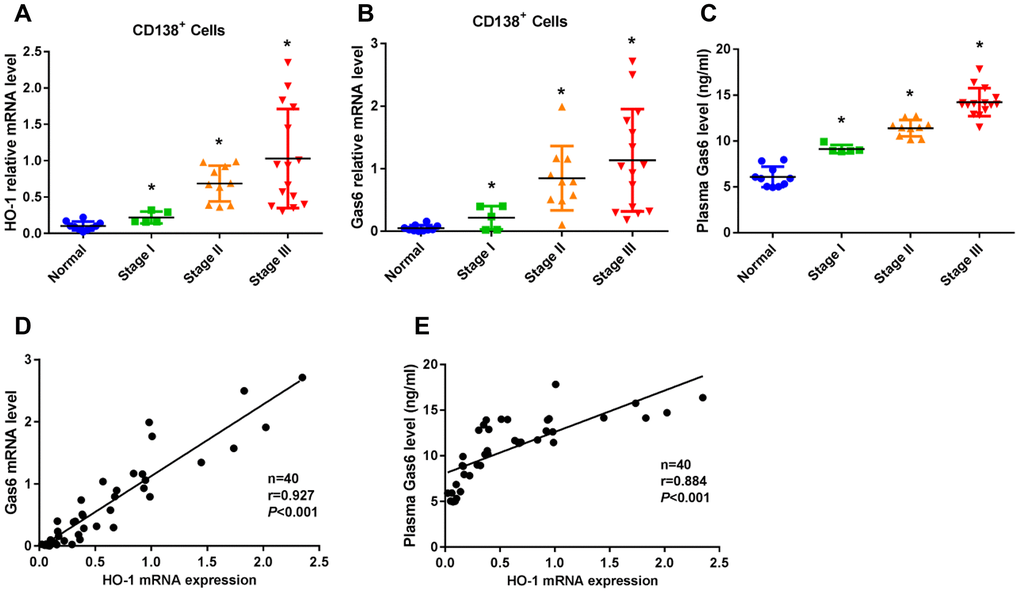 To evaluate the relationship between the expression of HO-1 and Gas6, we assessed HO-1 and Gas6 expression levels in CD138+ cells of bone marrow from patients at different stages of MM. Ten healthy donors and thirty patients with newly diagnosed MM, including ISS stage I (n=5), stage II (n=10) and stage III (n=15), entered into this study. The characteristics of MM patients were presented in Supplementary Table 1. HO-1 expression was found to be higher in CD138+ cells from MM patients than those healthy donors (P<0.01, Figure 1A). Similar findings were also observed in Gas6 mRNA expression (P<0.01, Figure 1B). Additionally, plasma levels of Gas6 were progressively elevated with increasing levels from stage I to III of MM patients (P<0.01, Figure 1C). Moreover, a Pearman correlation analysis showed that both mRNA level (r=0.927; P<0.001) and plasma level (r=0.884; P<0.001) of Gas6 were significantly associated with the level of HO-1 mRNA expression (Figure 1D, 1E).