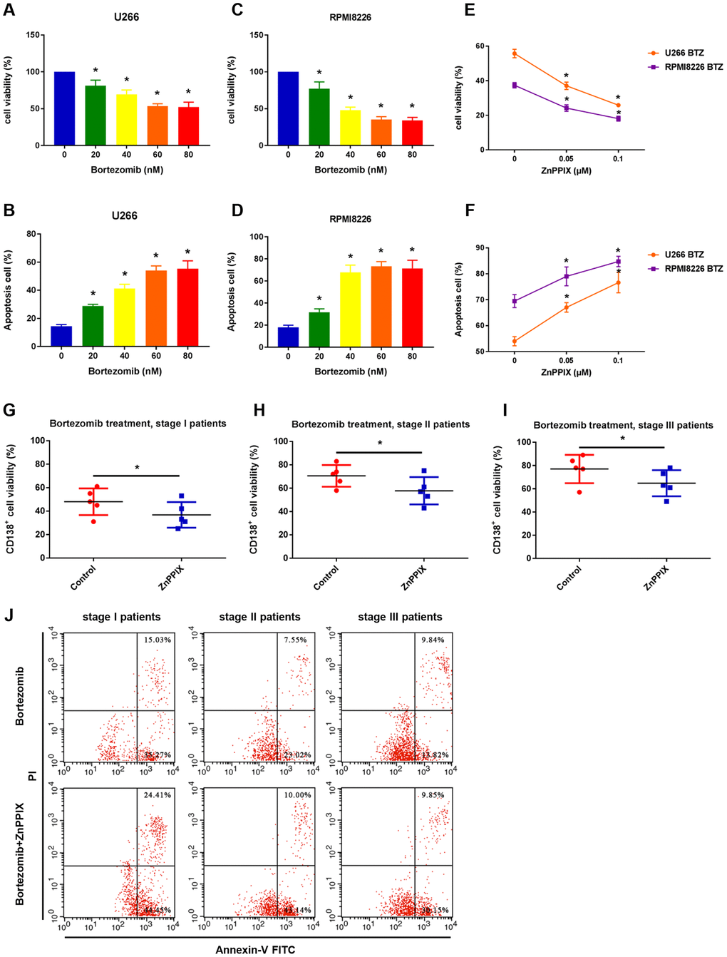 To determine the effect of bortezomib on cytotoxicity in human MM cell lines (U266 and RPMI8226), we treated cells with increasing concentrations of bortezomib for 24 hours. As shown in Figure 2A, 2B, U266 cell viability was reduced by approximately 50% and cell apoptosis rate reached approximately 50% at a dose of 60 nM. In RPMI8226 cells, the inhibition of cell viability and cell apoptosis rate were more than 50% at a dose of 40 nM (Figure 2C, 2D). Thus, the dose of 60 nM and 40 nM were chosen for U266 and RPMI8226 cells in the following bortezomib treatment, respectively. We next evaluated effect of HO-1 inhibition combined with bortezomib on MM cells using HO-1 inhibitor ZnPPIX. The results showed that cell viability was inhibited and cell apoptosis was enhanced in a dose-dependent manner upon treatment with increasing concentrations of ZnPPIX (Figure 2E, 2F). Moreover, cell viability was also significantly decreased in human primary CD138+ cells treated with ZnPPIX compared with the group without ZnPPIX treatment (Figure 2G–2I). In addition, ZnPPIX increased apoptosis of CD138+ cells from stage I, stage II and stage III MM patients by 18.56%, 22.57% and 16.34%, respectively, compared with those without ZnPPIX treatment (Figure 2J). These results suggest that HO-1 inhibitor enhances myeloma cell sensitivity to bortezomib.