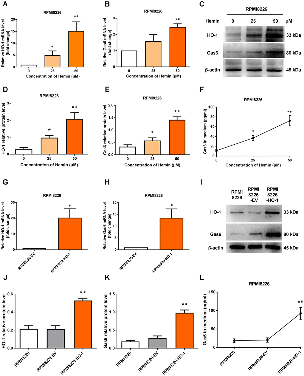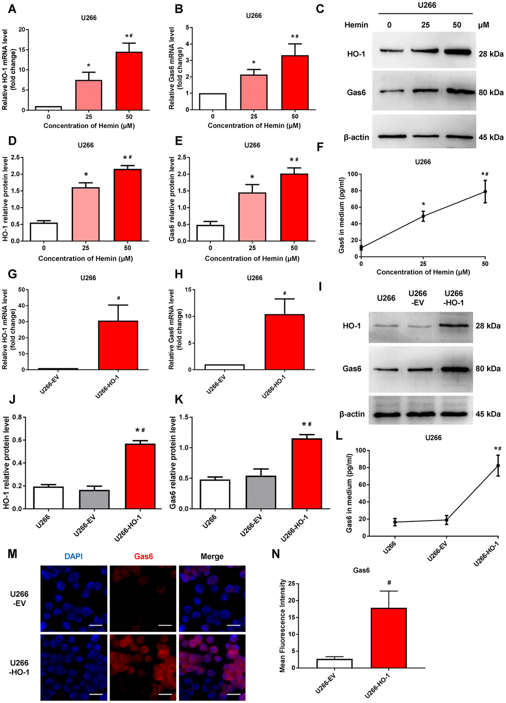 We next determine whether HO-1 regulates Gas6 expression in MM cells. U266 cells were treated with hemin to induce the expression of HO-1. Western blotting and qRT-PCR showed the upregulation of HO-1 with different concentration of hemin treatment (Figure 3A–3D). Then, we exposed U266 cells to increasing concentrations of hemin for 24 hours. As shown in Figure 3B–3E, compared with the control group cultured without hemin, the mRNA and protein levels of Gas6 were increased in U266 cells treated with increasing hemin concentrations (from 25 to 50 μM; P<0.01). Simultaneously, the secretion of Gas6 was gradually elevated with increasing concentrations of hemin in U266 cells (P<0.01; Figure 3F). Furthermore, HO-1-overexpressing myeloma cell line U266-HO-1 and its corresponding controls were established. Western blotting and qRT-PCR were used to verify transfection efficiency (Figure 3G, 3I–3J). Not only the mRNA and protein levels but also the secretion of Gas6 was significantly elevated by HO-1 overexpression (Figure 3H, 3K, 3L). Additionally, immunofluorescence analysis showed that Gas6 expression was marked increase in U266-HO-1 cells compared with U266-EV cells (Figure 3M, 3N). Similar results were also found in RPMI8226 cells (Figure 4). Moreover, we inhibited HO-1 by using a pharmacological inhibitor ZnPPIX, and knock down HO-1 gene by siRNA. The findings that HO-1 inhibition suppressed Gas6 expression and secretion were observed in myeloma cell (Supplementary Figures 1, 2).