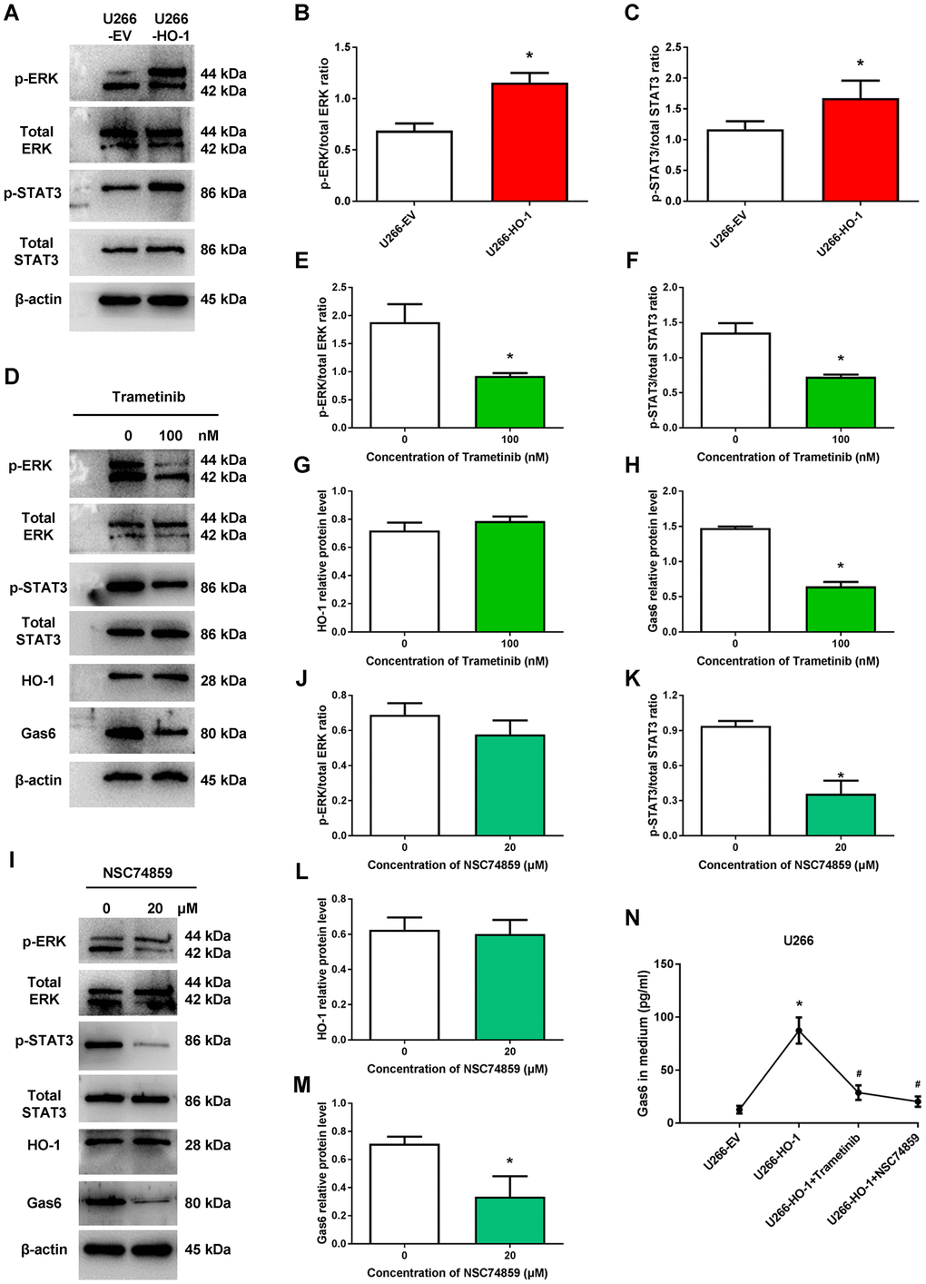 Previous study demonstrated the importance of STAT3 in promoting chemoresistance of cancer cells via transcriptional regulation [22]. Recent evidence revealed that Gas6 effect was STAT3-dependent [23]. Thus, to determine the mechanism by which HO-1 enhanced the expression of Gas6 in MM cells, we evaluated the expression of STAT3 and the related signal pathway. The results showed that the phosphorylation level of ERK and STAT3 were increased by HO-1 overexpression, respectively (Figure 5A–5C). Interestingly, we found that ERK inhibitor trametinib significantly reduced the expression of Gas6 and the ratio of p-STAT3/total STAT3, but did not influence HO-1 expression (Figure 5D–5H). However, the effect that Gas6 enhanced by HO-1 was block by STAT3 inhibitor NSC74859, whereas it had no significant effect on the expression of HO-1 and the ratio of p-ERK/total ERK (Figure 5I–5M). Beside, we observed that both trametinib and NSC74859 markedly decreased the production of soluble Gas6 in culture medium from myeloma cells (Figure 5N). These data reinforce our hypothesis that HO-1 regulates Gas6 production via ERK/STAT3 axis.