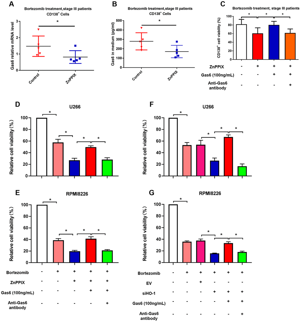Our findings showed that HO-1 inhibitor ZnPPIX enhances myeloma cell sensitivity to bortezomib (Figure 2). Interestingly, such processes were accompanied with a decrease in Gas6 mRNA level and the secretion of Gas6 in culture medium after ZnPPIX treatment (Figure 6A, 6B). To investigate whether the effect that HO-1 inhibition enhances bortezomib-sensitivity is mediated by Gas6 secretion, human primary CD138+ plasma cells were exposed to exogenous Gas6 for 24 hours. The CCK8 results showed that exogenous Gas6 significantly increased CD138+ cells viability, and this effect was reversed by Gas6 neutralizing antibody (Figure 6C). In addition, we also use ZnPPIX or HO-1 siRNA to inhibit HO-1 expression in U266 and RPMI8226 cells. As shown in Figure 6D–6G, exogenous Gas6 significantly blocked anti-proliferative effect enhanced by ZnPPIX or HO-1 siRNA, and Gas6 neutralizing antibody abolished pro-proliferation induced by Gas6.