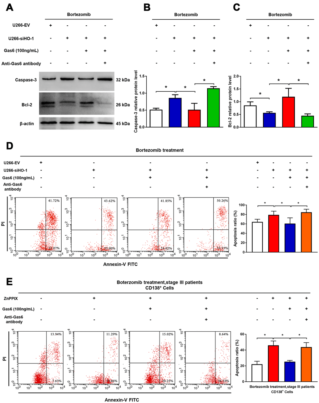 As shown in Figure 7, combination bortezomib and HO-1 inhibition treatment significantly aggravated U266 cell apoptosis compared with bortezomib alone. Exogenous Gas6 inhibited pro-apoptosis effect enhanced by HO-1 inhibition with a decrease in pro-apoptotic protein caspase-3 expression but an increase in anti-apoptotic protein Bcl-2 expression, and Gas6 neutralizing antibody reversed anti-apoptosis induced by Gas6 (Figure 7A–7D). Similar findings were also observed in human primary CD138+ cells (Figure 7E). Collectively, these results suggest that HO-1 inhibition enhance sensitivity to bortezomib in myeloma cells via suppressing Gas6 production.