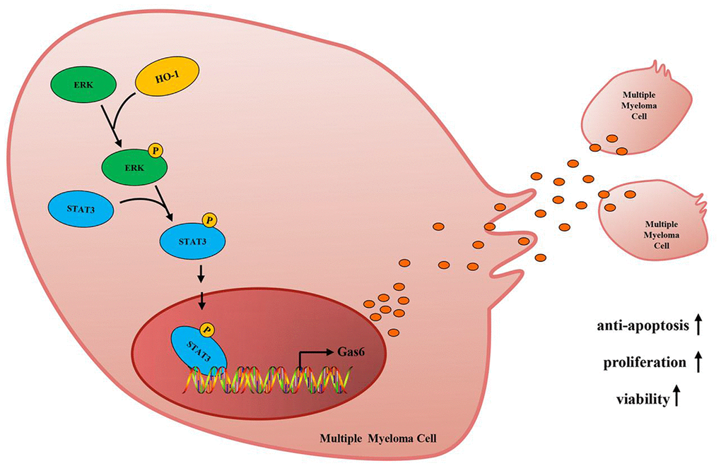 ERK1/2 signaling is involved in regulating a variety of cancer cells functions, such as cell proliferation, migration, differentiation and apoptosis [37–40]. Mandal R et al illustrated that ERK1/2 signaling was activated in about half of MM patients and was considered to be a potential target in MM [41]. Another study demonstrated that activated ERK1/2 phosphorylated downstream substrates, such as transcription factors, that controlled the development of cancer [42]. Recently, it has been suggested that Gas6 expression is mediated by transcription factor STAT3 in pro-inflammatory condition [23]. However, whether ERK/STAT3 axis is involved in the process of HO-1 enhanced Gas6 expression in MM has not been explored. In present study, we found that HO-1 activated ERK/STAT3 signaling in MM cells. Using the ERK1/2 signaling inhibitor trametinib significantly reduced HO-1 enhanced Gas6 and STAT3 expression, but not in HO-1 expression. Furthermore, we observed that STAT3 inhibitor NSC74859 greatly decreased Gas6 expression, whereas HO-1 and ERK1/2 phosphorylation were not affected by NSC74859. Hence, our findings suggested that HO-1 enhanced Gas6 expression and subsequently bortezomib resistance by activating ERK/STAT3 axis (Figure 8).