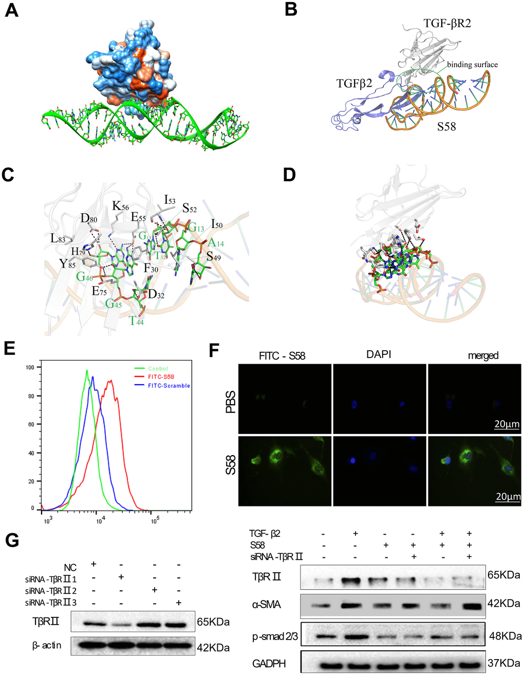 Documentation of protein structure information (https://www.uniprot.org/uniprot/P37173.fasta, https://www.uniprot.org/uniprot/P01137.fasta, http://www.prof.org/uniprot/P10600.fasta). The secondary structure of S58 was predicted according to its nucleotide sequence (Supplemental Figure 1A). The predicted 2D least energy DNA structure was used for follow-up research and analyzed. The interaction between TβR II and S58, made up of nucleotides, was studied by a structure-based approach. The RNA composer online server was first used to construct a closed and open three-dimensional structural model of the nucleic acid aptamer. Then, using the software Amber to perform simple optimization (minimization), we adjusted the corresponding nucleic acid structure, and used Pymol software to convert U in the RNA sequence into T, resulting in the corresponding DNA three-dimensional structure. Finally, the structure of S58 was optimized by using the molecular structure of Gromacs, eliminating the barriers between nucleic acid structures, and extracting nucleic acid structures under the average structure.