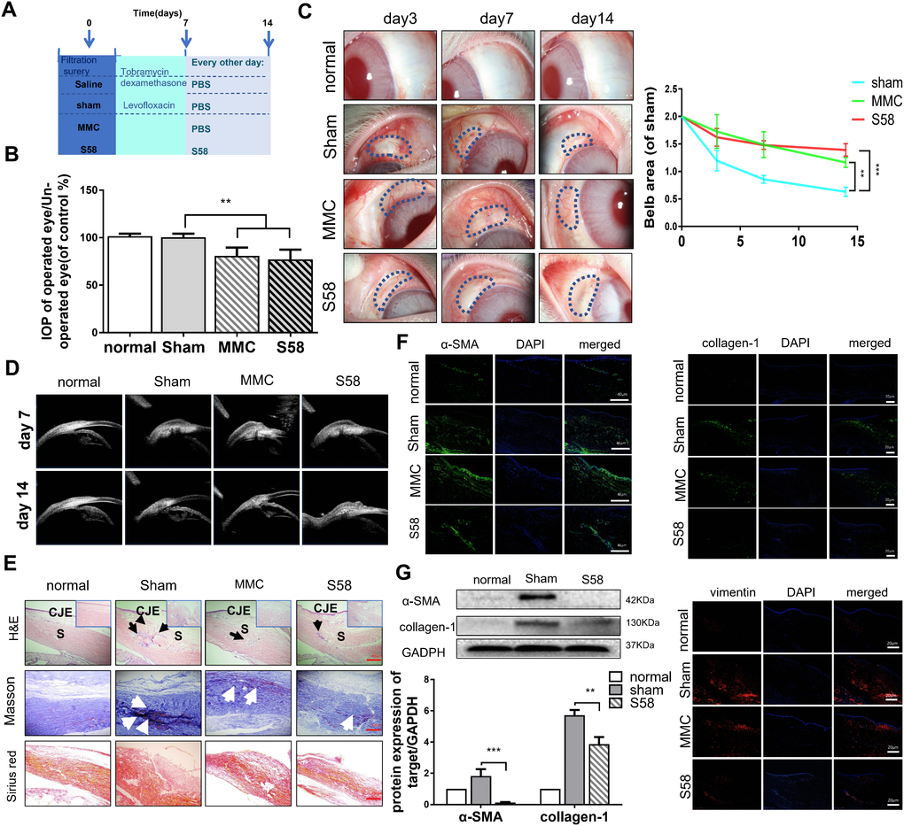 Our animal treatment program is shown in Figure 2A. Topical application of S58 (20nM/drop) 4 times daily significantly improved the outcomes in rabbits after GFS (Supplementary Figure 2). Analysis of mean IOP in the surgical eyes showed no significant differences between the MMC and S58 groups on postoperative day 14, but the IOP values of MMC group were higher than the sham and S58 groups after 6 postoperative weeks (Figure 2B and Supplementary Figure 3C). Slit lamp examination showed the typical appearance of the blebs at the 1 week, 2 weeks, 3 weeks, 4 weeks, 5 weeks, and 6weeks postoperative endpoints. Representative images showed that the S58 and MMC groups exhibit significantly prolonged bleb survival compared to the sham group. There are slightly bulged, thinner blebs and scleral flap were clearly visible in the MMC-treated and S58-treated groups. Conversely, the blebs were small, thick, flat, and vascularized in the sham group. The total area of functional filtration bleb in the S58 group was significantly larger than in the MMC group, except at postoperative day 7 (Figure 2C and Supplementary Figure 3B). The ultrasound biomicroscopy (UBM) was used to further observe the cystic structure of the conjunctival filtration bleb. A cystic cavity was seen under the conjunctiva of the operation area. During postoperative week 6, the conjunctival tissues were thickened in the sham group compared to S58 group, and no obvious cavities were observed under the sham group. A limited cystic cavity was still visible in the MMC group and the 58 group (Figure 2D and Supplementary Figure 3A).