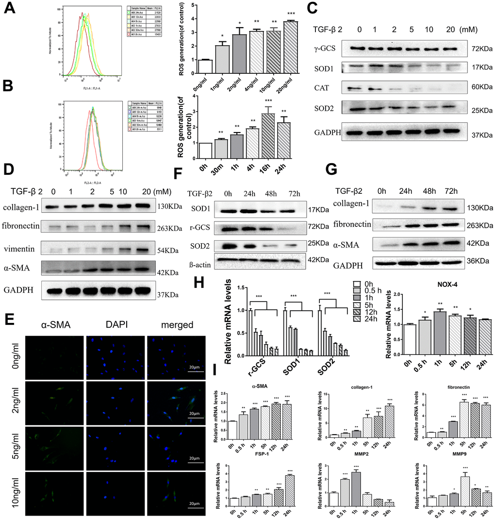 Previous reports have indicated that exposure to TGF-βs could increase intracellular ROS and sustained cellular stress response, increasing the occurrence of EMT and ultimately inducing tissue fibrosis [33, 34]. By flow cytometry analysis, the MitoSOX red and 2’,7’-dichlorofluorescin diacetate (H2DCF-DA) assay revealed that HConFs, with different TGF-β2 treatment times and concentrations, provoked a sustaining release of mitochondrial and cytosolic superoxide that remained higher than the untreated group, indicating that TGF-β2-induced HConFs were in a state of sustained high stress (Figure 3A, 3B). Moreover, TGF-β2 precondition significantly decreased levels of antioxidants involved in ROS scavenging, SOD1/2 (Superoxide dismutase) and γ-GCS (γ-glutamyl cysteine synthetase), in a time and dose-dependent manner (Figure 3C, 3F). We saw a positive correlation between the expression of α-SMA and the concentration of TGF-β2 (Figure 3E). In contrast, TGF-β2 treatment of HConFs significantly increased the protein and gene expression of fibrosis associated markers in a time and dose-dependent manner. However, MMP-2 and MMP-9 gene expression peaked at 1h-5h and then decreased (Figure 3D, 3G, 3I). Antioxidation-related gene expression continuously decreased over time in TGF-β2-induced HConFs (Figure 3H).