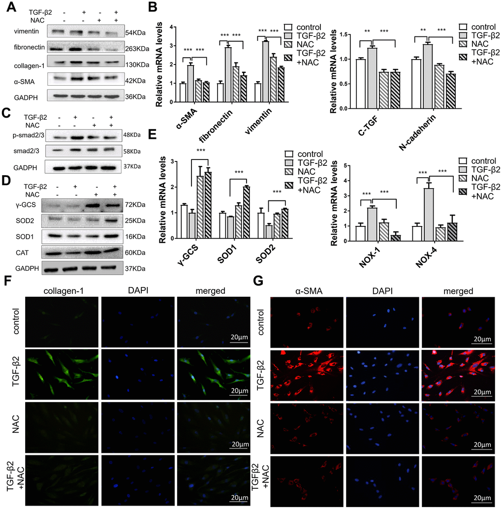 Previous reports have shown that oxidant-antioxidant regulation imbalance is key to oxidative stress in ROS, causing fibrotic diseases [34, 35], and the main cause of TGF-βs-induced oxidative stress damage is the accumulation of ROS. Acetylcysteine (N-acetyl-l-cysteine) (NAC) inhibits the production of ROS of HConFs in a high-glucose environment [36]. We observed that NAC significantly reduced α-SMA, vimentin, fibronectin, and collagen-1 protein levels in TGF-β2-induced HConFs (Figure 4A) and expression of fibronectin, vimentin, C-TGF (a potent fibrotic cytokine), N-cadherin, and α-SMA genes (Figure 4B). NAC also inhibited p-smad expression (Figure 4C). We further observed that NAC treatment reversed TGF-β2-induced changes in γ-GCS, SOD1/2 and CAT protein and gene levels in HConFs (Figure 4D, 4E). NAC may inhibit TGF-β2-induced stress by increasing the gene and protein levels of SOD1/2 and γ-GCS. Moreover, the results of NOX-1 and NOX-4 confirmed the decrease of ROS in TGF-β2-induced HConFs. Immunofluorescence staining of α-SMA and collagen-1 revealed that NAC significantly alleviated the levels of TGF-β2-induced fibrosis (Figure 4F, 4G). We could conclude that NAC blockade of ROS production inhibited TGF-β2-induced HConFs fibrosis. The lower level of ROS is closely associated with a higher success rate of surgery.