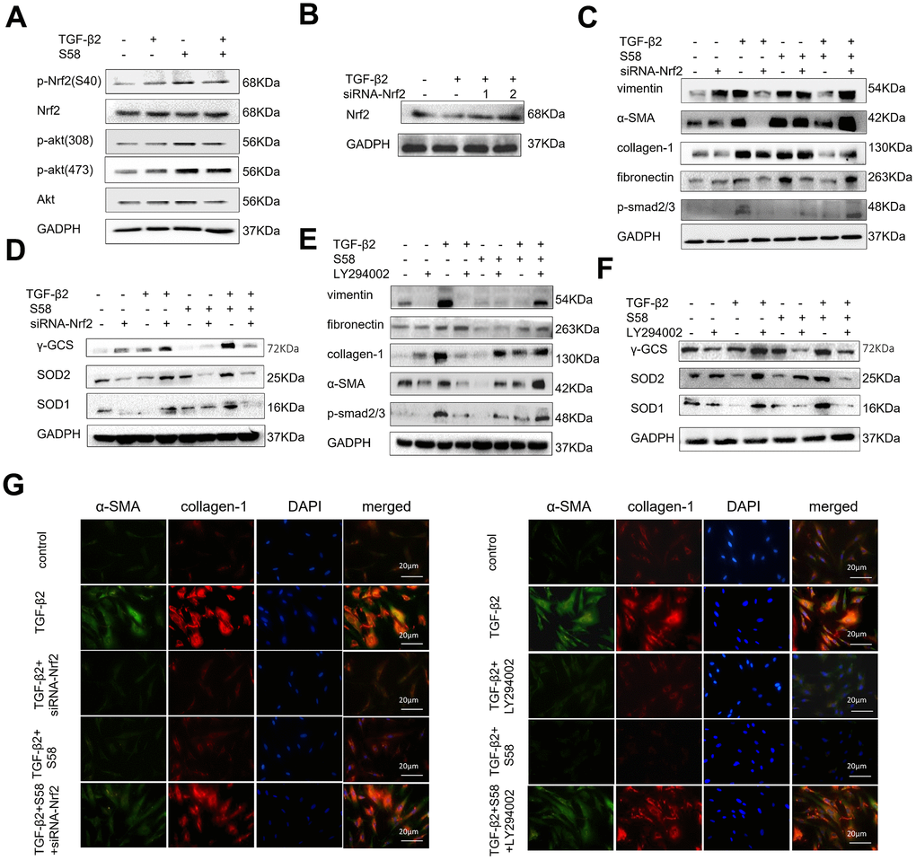 It has been reported that redox homeostasis is maintained by the activation of Nrf2, and its downstream transcriptional targets [40]. Nrf2 activation increases the expression of multiple transcription factors associated with antioxidant, anti-inflammatory, and other cytoprotective pathways by binding to the antioxidant response element [41]. We found that S58 significantly increased phosphorylation of Akt and promoted phosphorylation of Nrf2 expression (Figure 7A). Furthermore, LY294002 (a PI3K/Akt inhibitor) and siRNA-Nrf2 (Figure 7B) were applied to explore the possible involvement of the PI3K/Akt/Nrf2 signaling pathway in adjusting the oxidative stress of HConFs. Precondition with siRNA-Nrf2 / LY294002 significantly decreased the anti-fibrosis capacity of S58 (Figure 7C, 7E) and decreased expression of intracellular antioxidants (Figure 7D, 7F). Immunofluorescence staining confirmed the important role of activating PI3K/Akt/Nrf2 signaling pathway in S58 anti-fibrosis (Figure 7G). Together, the above data indicate that S58, specific targeting TβR II, inhibits fibrosis and activates PI3K/Akt/Nrf2 signaling pathway in HConFs.