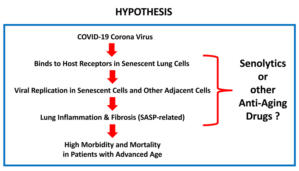 Thus, one hypothesis is that the COVID-19 virus significantly increases mortality in patients with advanced chronological age, because these patients have an increased number of senescent lung cells, which are the host target for COVID-19 viral infection. Interestingly, senescent cells also show an increased propensity for enhanced protein synthesis, which is required to produce SASP inflammatory mediators, which would make senescent cells an ideal host target for efficient viral replication.