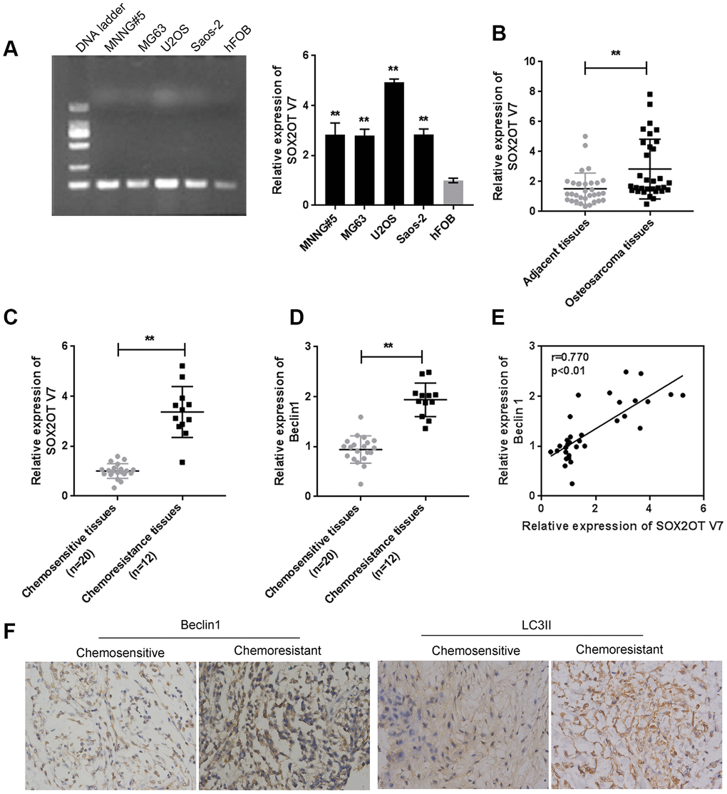 As for autophagy markers, the mRNA level of Beclin 1 was higher in chemoresistant tissues than in chemosensitive tissues (Figure 1D). IHC staining showed that the Beclin 1 and LC3II levels were increased in chemoresistant tissues (Figure 1F). Moreover, Sox2OT-V7 expression was positively correlated with Beclin 1 (Figure 1E). These data indicate that Sox2OT-V7 is overexpressed in OS, and positively correlated with autophagy markers.