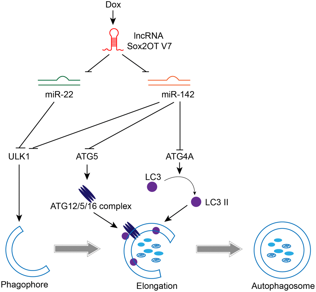 lncRNA Sox2OT-V7 promotes Dox-induced autophagy and chemoresistance in OS via tumor-suppressive miR-142/miR-22 and downstream core Atg genes (Figure 10). Upon further in vivo validation, these findings may provide new directions for combating OS chemoresistance to Dox-based therapies.