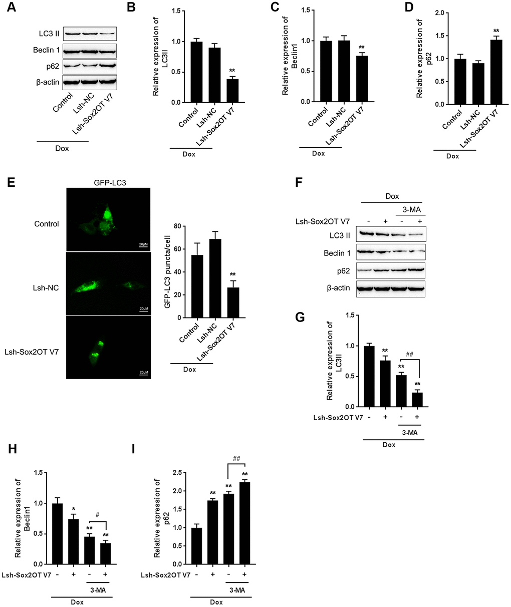 U2OS cells with stable eGFP-LC3 expression were used to confirm Dox-induced autophagy using rapamycin treatment as a positive control. Figure 2B shows that the autophagy in U2OS cells was increased by Dox and rapamycin treatment. As shown in Figure 2C, green puncta were increased after exposure to Dox in U2OS cells with stable eGFP-LC3 expression; this result was similar to that of rapamycin. Moreover, Sox2OT-V7 expression was induced by Dox treatment in a concentration-dependent manner (Figure 2D), further indicating that Dox treatment induced autophagy and Sox2OT-V7 expression in U2OS cells.
