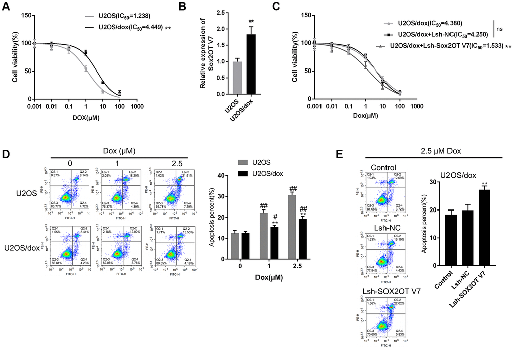 After confirming that Sox2OT-V7 silencing could block autophagy in U2OS cells, we continued to investigate whether lncRNA Sox2OT-V7 silencing could resensitize OS cells to Dox treatment. As shown in Figure 4A, under Dox treatment, the IC50 value of the original U2OS was 1.238 μM, while that of U2OS/Dox was upregulated to 4.449 μM, indicating that U2OS/Dox cells are resistant to Dox treatment. In U2OS/Dox cells, the expression of lncRNA Sox2OT-V7 was significantly upregulated, compared to that in the original U2OS cells (Figure 4B). After generating lncRNA Sox2OT-V7 silencing in U2OS/Dox cells, the suppressive effects of Dox on U2OS/Dox cell viability were significantly (**P<0.01) enhanced, as manifested by a reduced IC50 value: 4.380 μM for non-transfected U2OS/Dox cells, 4.250 for Lsh-NC-transfected U2OS/Dox cells, and 1.533 for Lsh-Sox2OT-V7-transfected U2OS/Dox cells (Figure 4C). Moreover, the apoptosis percentage of U2OS/Dox cells was significantly lower than that of the original U2OS cells (Figure 4D). After silencing lncRNA Sox2OT-V7 in U2OS/Dox cells, the apoptosis rate was increased compared to that in the non-transfected cells and Lsh-NC-transfected cells (Figure 4E).