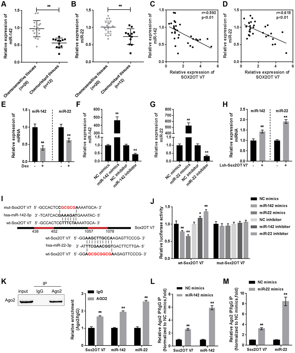 LncRNAs can exert their biological functions by serving as sponges for miRNAs to counteract miRNA-mediated suppression of miRNA downstream targets [12]. To investigate the molecular mechanism of Sox2OT-V7 in Dox-induced autophagy in OS, we searched TCGA online data for candidate miRNAs related to Sox2OT-V7 and autophagy. As shown in Supplementary Table 2, some miRNA, including miR-22 and miR-142, were negatively correlated with Sox2OT-V7 expression in OS (Supplementary Figure 1). miR-22 regulates 5-FU sensitivity by inhibiting autophagy and promoting apoptosis in colorectal cancer cells [13], while miR-142 targets ATG5/ATG16L1 to sensitize hepatocellular carcinoma cells to sorafenib by inactivating autophagy [14]. Moreover, online tools indicate that Sox2OT-V7 may target miR-142 and miR-22. Thus, we hypothesize that Sox2OT-V7 may exert its effect on OS by regulating miR-142 and miR-22.