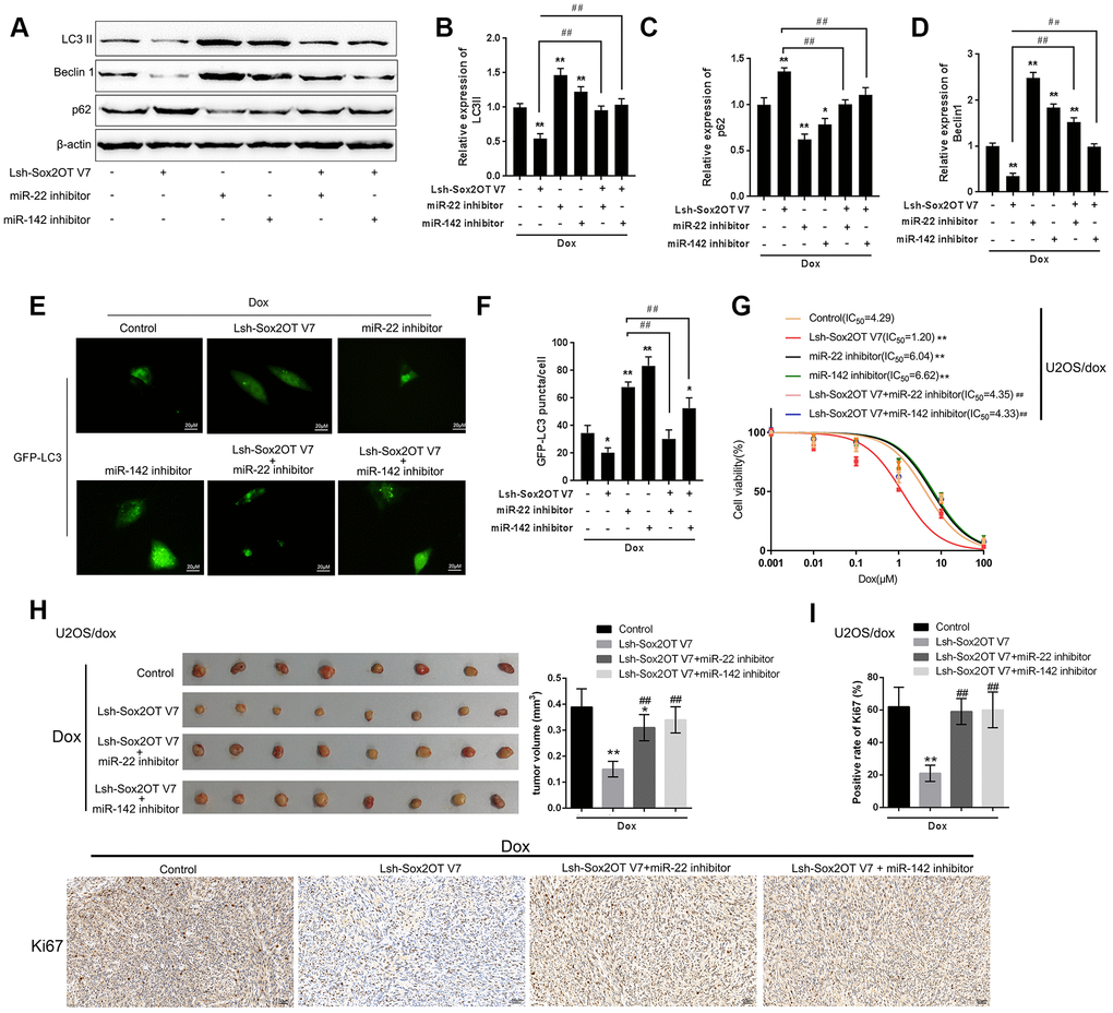 After confirming the direct binding between Sox2OT-V7 and miR-142 and between Sox2OT-V7 and miR-22, we investigated the dynamic effect of Sox2OT-V7, miR-142, and miR-22 on Dox-induced autophagy in U2OS cells. miR-142 or miR-22 inhibition increased the protein levels of LC3II and Beclin 1 while decreased p62 protein under Dox treatment; the effect of miR-142 or miR-22 inhibition was partially reversed by 3-MA (Supplementary Figure 3A–3H). Next, U2OS cells were cotransfected with Lsh-Sox2OT-V7 and miR-142 or miR-22 inhibitor and the protein levels of autophagy markers and autophagy flux were examined. As revealed by immunoblotting, Dox-induced LC3II and Beclin 1 protein upregulation was partially attenuated by Sox2OT-V7 silencing but enhanced by miR-142 inhibition or miR-22 inhibition (Figure 6A–6D). Moreover, the effect of Sox2OT-V7 silencing was partially reversed by miR-142 inhibition or miR-22 inhibition (Figure 6A–6D). Furthermore, IF observation revealed similar results: miR-142 inhibition or miR-22 inhibition increased while Sox2OT-V7 silencing decreased the number of green puncta, the effect of Sox2OT-V7 silencing was also partially reversed by 142 inhibition or miR-22 inhibition (Figure 6E, 6F). Consistently, upon Dox treatment, Sox2OT-V7 silencing significantly reduced the IC50 value of U2OS/Dox cells to 1.20 μM, and miR-22 or miR-142 inhibition increased the IC50 values to 6.04 and 6.62 μM, respectively; the effects of Sox2OT-V7 silencing on U2OS/Dox cell viability were partially reversed by either miR-22 inhibition (IC50 = 4.35 μM) or miR-142 inhibition (IC50 = 4.33 μM) (Figure 6G). These data indicate that Sox2OT-V7 modulates Dox-induced autophagy in U2OS cells via its downstream targets miR-142 and miR-22, therefore affecting the chemoresistance of Dox-resistant OS cells to Dox.