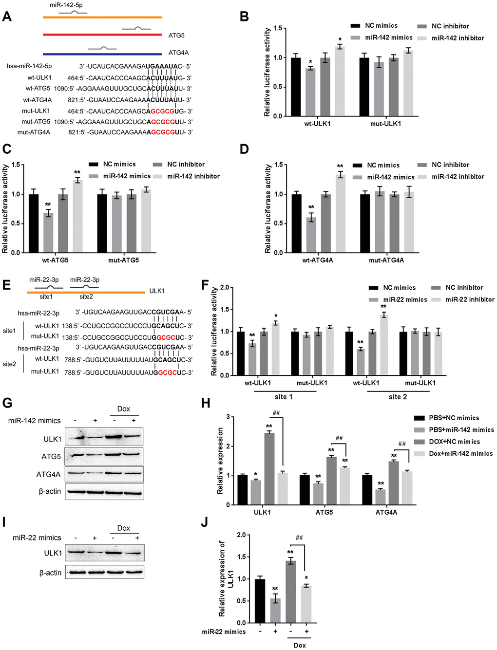 Next, the effect of miR-142 and miR-22 on the above-described factors was investigated under Dox treatment. The protein levels of ULK1, ATG4A, and ATG5 were markedly decreased by miR-142 overexpression but increased by Dox treatment, and Dox-induced ULK1, ATG4A, and ATG5 upregulation was partially reversed by miR-142 overexpression (Figure 7G, 7H). Similarly, ULK1 protein was significantly decreased by miR-22 overexpression but increased by Dox treatment, and Dox-induced ULK1 upregulation was partially reversed by miR-22 overexpression (Figure 7I, 7J). These data indicate that miR-142 targets ULK1, ATG4A, and ATG5, and miR-22 targets ULK1 to regulate the expression of these critical autophagy-related factors upon Dox treatment.