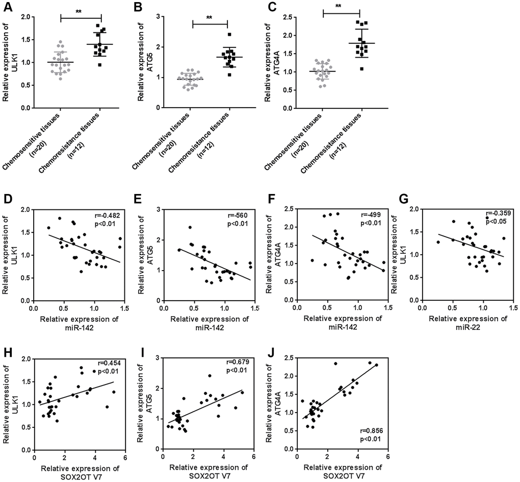 To further confirm the above findings, we examined the expression of ULK1, ATG4A, and ATG5 in tissue samples. The expression of ULK1, ATG4A, and ATG5 was higher in chemoresistant OS tissues than in chemosensitive tissues (Figure 9A–9C). MiR-142 was negatively correlated with ULK1, ATG4A, and ATG5 (Figure 9D–9F). MiR-22 was negatively correlated with ULK1 (Figure 9G). Sox2OT-V7 was positively correlated with ULK1, ATG4A, and ATG5 (Figure 9H–9J).