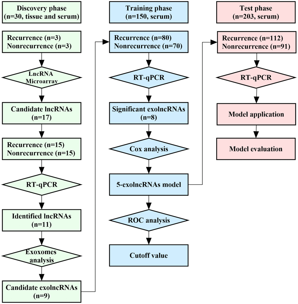 This study was designed as 3 phases, and the flowchart was shown in Figure 1. In discovery phase, matched tissues and sera samples were collected from 30 CRC patients (15 cases with recurrence and 15 cases with nonrecurrence) at Shandong Provincial Third Hospital between August 2010 and May 2011 to identify recurrence-related exolncRNAs. Among them, 3 recurrence and 3 nonrecurrence patients were selected for LncRNA microarray analysis. Then, all were detected using reverse transcription real-time quantitative polymerase chain reaction (RT-qPCR) to verify the results of microarray. The confirmed lncRNAs were further tested in exosomes of serum, and the closely related were selected for next study. Next, 353 CRC patients enrolled from Qilu Hospital of Shandong University between January 2012 and December 2013 were randomly split into a 150-patient training set and a 203-patient test set. In training phase, exolncRNAs levels were detected using RT-qPCR in serum of 150 CRC patients to further evaluate their clinical value and construct model. In test phase, another 203-patient set was used to evaluate the prognostic value of 5-exolncRNAs panel. CRC patients with incomplete medical records or receiving any anticancer treatment before surgery were not included in this study. In addition, 30 CRC patients and 30 healthy subjects were collected for testing the 5-exolncRNAs panel in plasma samples. This study was approved by the Ethics Committee of Shandong Provincial Third Hospital and Qilu Hospital of Shandong University, and written informed consent was obtained from each patient.