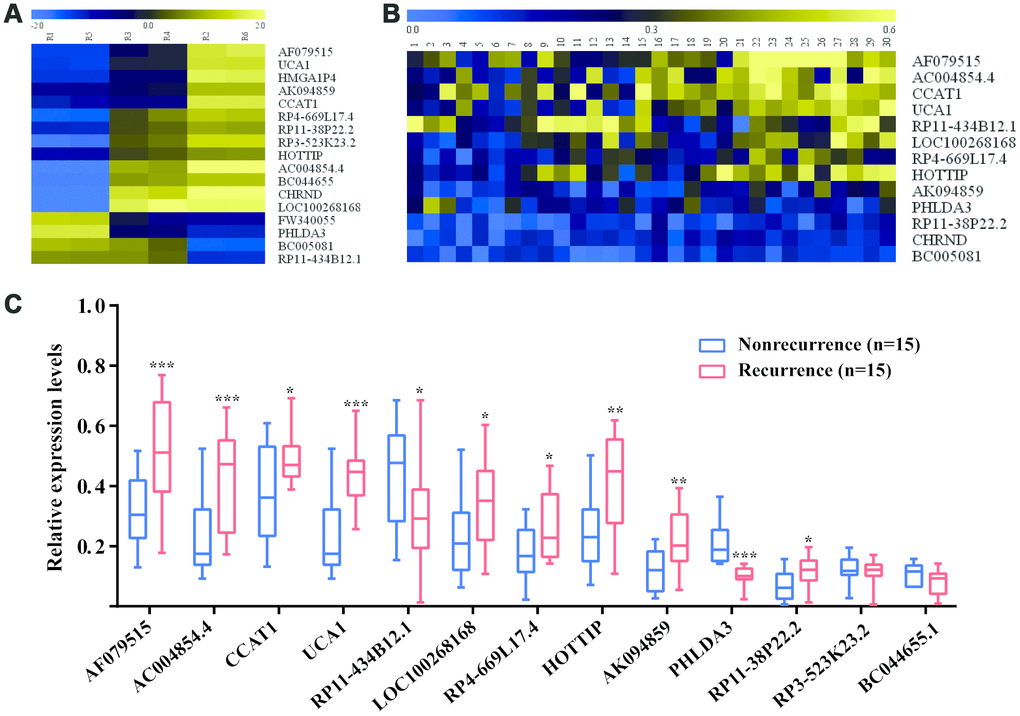 Using high-throughput human genome-wide lncRNA microarray, a total of 4041 lncRNAs were found at least a 2-fold change difference and a P value less than 0.05 between tumor tissues and matched adjacent normal tissues (Supplementary Figure 1). The primary data in microarray analysis have been deposited in the Gene Expression Omnibus and the accession numbers is GSE84983. Among them, 17 lncRNAs displayed average expression>10, fold chang >2 and P value<0.05 between recurrence and nonrecurrence patients (Figure 2A). Then, the above lncRNAs were detected by RT-qPCR in all CRC patients at discovery phase (Figure 2B). As shown in Figure 2C, significantly differentially expressed 11 lncRNAs were identified, of which 9 upregulated (AF079515, AC004854.4, CCAT1, UCA1, LOC100268168, RP4-669L17.4, HOTTIP, AK094859, and RP11-38P22.2) and 2 downregulated (RP11-434B12.1 and PHLDA3) in CRC patients with recurrence compared to those without recurrence.