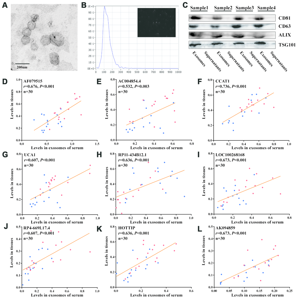 The exosomes extracted from serum exhibited a typical cup-shaped morphology under TEM (Figure 3A). NTA data showed a clear, narrow peak in size distribution at around 90nm, which corresponded to the size of exosomes (Figure 3B). Meanwhile, the exosomes markers (CD81, CD63, ALIX and TSG101) were only expressed in exosomes while not in the supernatants by Western blot (Figure 3C). We tested whether the 11 recurrence-associated lncRNAs could be efficiently amplified in exosomes extracted from corresponding serum. As shown in Figure 3D–3L, the exosomal levels of 9 lncRNAs (AF079515, AC004854.4, CCAT1, UCA1, RP11-434B12.1, LOC100268168, RP4-669L17.4, HOTTIP and AK094859) were significantly correlated with their expression levels of tissues (r>0.5, P<0.05).