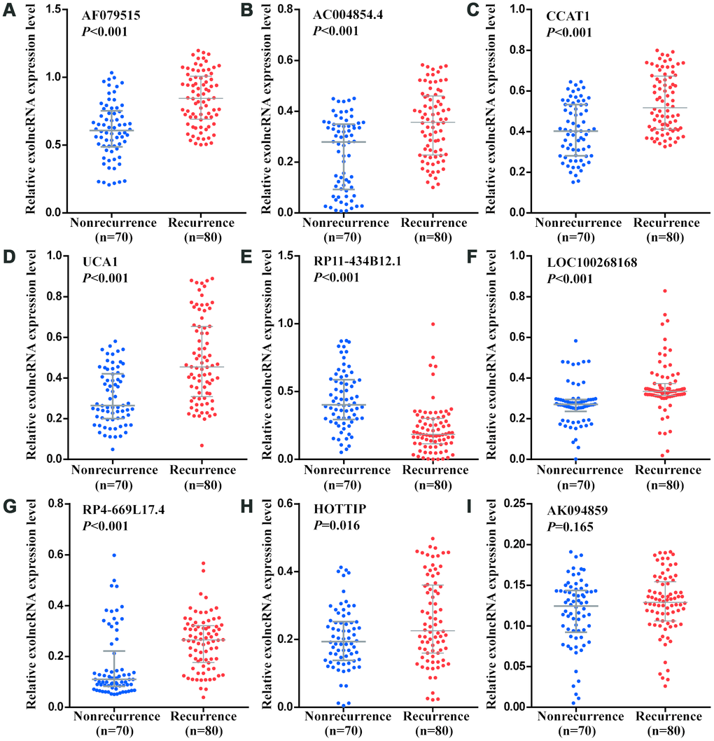 Using RT-qPCR to another 150 CRC patients in training phase, we confirmed the expression pattern of 9 candidates. As shown in Figure 4, the levels of 7 exolncRNAs (AF079515, AC004854.4, CCAT1, UCA1, LOC100268168, RP4-669L17.4 and HOTTIP) were significantly increased, and RP11-434B12.1 was significantly decreased in CRC recurrence group compared with those in nonrecurrence group, while AK094859 levels showed no significant difference between two groups.