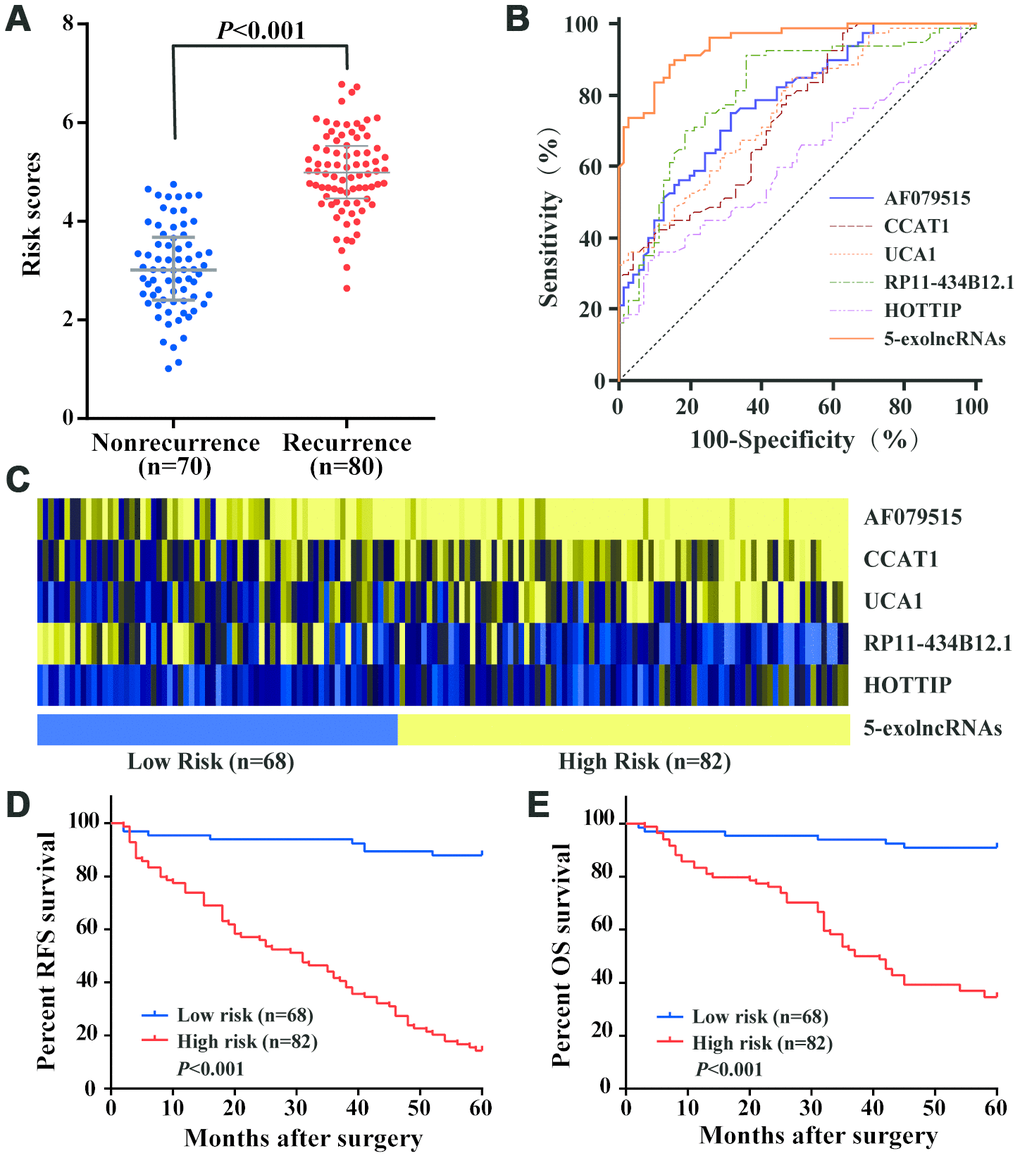 Univariate Cox regression analysis showed the above 8 recurrence-associated exolncRNAs were significantly associated with RFS. Then, we put them into multivariable cox model, and found only AF079515, CCAT1, UCA1, RP11-434B12.1 and HOTTIP retained significance for RFS. Thus, we derived a formula according to the levels of 5 exolncRNAs, weighted by their regression coefficient, to calculate the risk score: Risk Score=2.924×AF079515+ 2.349×CCAT1+ 2.146×UCA1-1.949×RP11-434B12.1+ 2.475×HOTTIP.