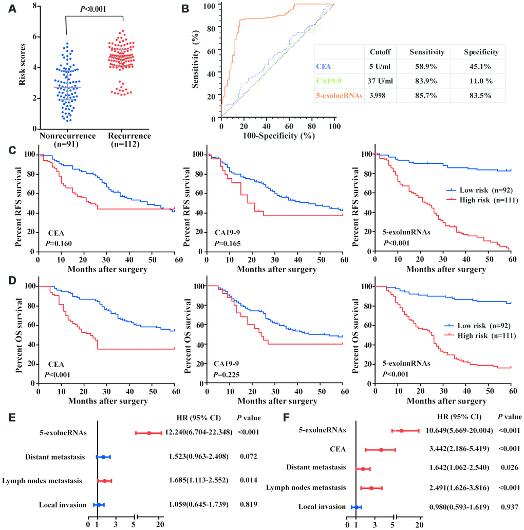 We calculated the risk score of 5-exolncRNAs panel according to the formula obtained from the training set in an independent testing set with 203 cases. Similar to the training set, the risk scores in CRC recurrence group were significantly higher than those in nonrecurrence group (Figure 6A). The risk scores of 5-exolncRNAs panel were also significantly in patients with high grade of local invasion, positive regional lymph nodes metastasis, positive distant metastasis and high CEA levels, but showed no relationship with age, gender, Tumor location, Tumor size, Differentiation and CA19-9 levels (Supplementary Table 3). Then, we compared the 5-exolncRNAs panel with serum traditional tumor marker, CEA and CA19-9 in prognosis evaluation. We first employed the ROC analysis to evaluate the predictive accuracy for CRC recurrence, and found 5-exolncRNAs panel had significantly higher AUC value than CEA and CA19-9 (Figure 6B). With their respective cutoff values, 5-exolncRNAs panel showed both high sensitivity and specificity (Figure 6B). According to the Kaplan–Meier curve (Figure 6C and 6D), CRC patients with high high-risk scores exhibited shorter RFS and OS than low-risk patients. Meanwhile, CRC patients with high CEA only showed lower OS (P<0.001) while not RFS (P>0.05). And CA19-9 had not significant relationship with RFS and OS (both P>0.05).