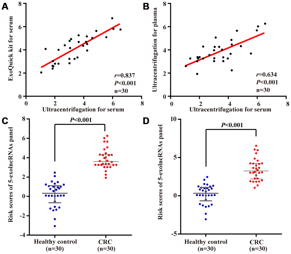 We first compared ExoQuick isolation method with ultracentrifugation method in detection of 5-exolncRNAs panel using 30 CRC serum samples. As shown in Figure 7A, there was a significant relationship. Using the ultracentrifugation-based method for isolation of exosomes in above 30 CRC patients, we found the levels of 5-exolncRNAs panel in plasma samples were significantly correlated with those in paired serum samples (Figure 7B). The risk scores of 5-exolncRNAs panel in both plasma and serum of CRC patients were significantly higher than those in healthy controls (Figure 7C and 7D).