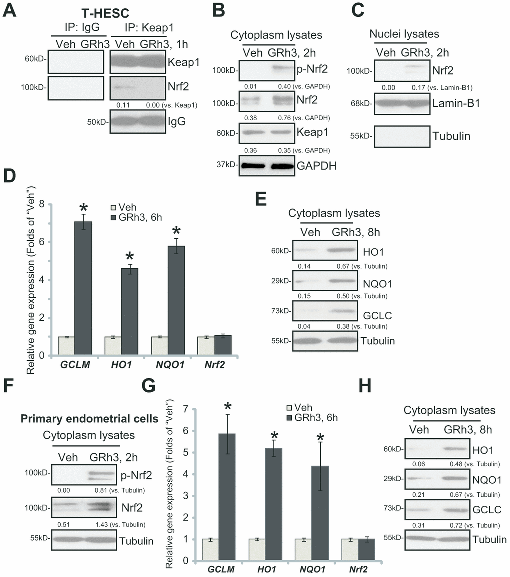 We first tested whether GRh3 could activate Nrf2 signaling in endometrial cells. Performing the co-immunoprecipitation (“Co-IP”) assay, we show that Nrf2 associated with its suppressor protein Keap1 in the untreated T-HESC human endometrial cells (Figure 1A). Significantly, following GRh3 (10 μM, based on the previous study [7]) treatment, Keap1-Nrf2 association was disrupted (Figure 1A). In the GRh3-treated T-HESC cells, GRh3 induced Nrf2 Ser-40 (S40) phosphorylation and cytosol Nrf2 protein accumulation (Figure 1B), an initial step for Nrf2 cascade activation [21–24]. Keap1 expression was, however, unchanged (Figure 1B). In response to GRh3, the accumulated Nrf2 translocated to the nuclei of T-HESC cells, causing increased Nrf2 protein in the nuclei lysates (Figure 1C).