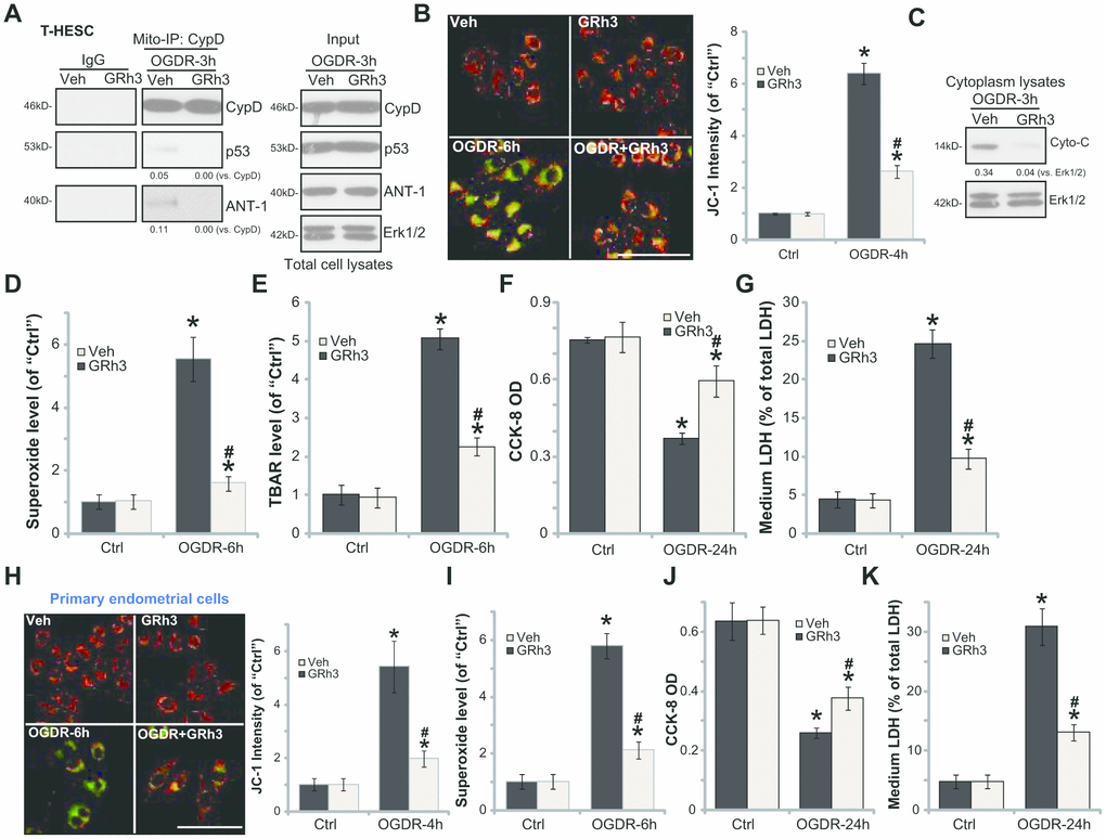 In line with the previous findings, we here showed that OGDR stimulation in T-HESC endometrial cells induced programmed necrosis [7, 8]. It was evidenced by cyclophilin-D (CypD)-p53-adenine nucleotide translocator-1 (ANT-1) mitochondrial association (Figure 2A), mitochondrial depolarization (JC-1 green fluorescence accumulation, Figure 2B) and cytosol cytochrome c release (Figure 2C). Furthermore, in OGDR-treated T-HESC cells, significant ROS production was detected by superoxide accumulation (Figure 2D) and increase levels of lipid peroxidation (TBAR intensity, Figure 2E). Importantly, GRh3 pretreatment (for 2h) significantly attenuated OGDR-induced programmed necrosis and oxidative injury in T-HESC cells (Figure 2A–2E).