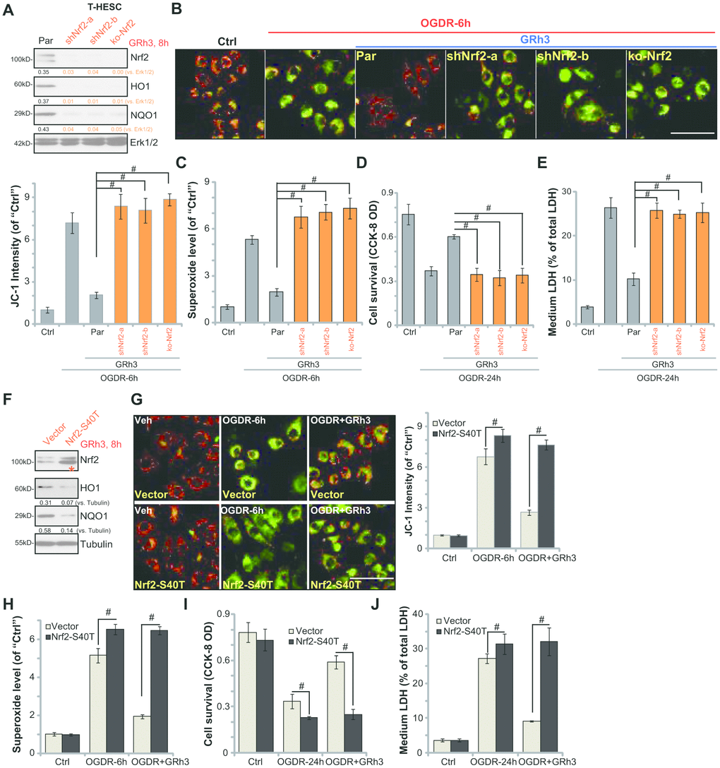 As shown, the applied Nrf2 shRNA or Nrf2-KO construct resulted in depletion of Nrf2 in T-HESC cells, even with GRh3 stimulation (Figure 3A). Furthermore, GRh3-induced HO1 and NQO1 expression was completely blocked by Nrf2 shRNA or KO (Figure 3A). Significantly, in Nrf2-silenced or Nrf2-KO T-HESC cells, GRh3 pretreatment failed to inhibit OGDR-induced mitochondrial depolarization (JC-1 assay, Figure 3B) and ROS production (testing superoxide contents, Figure 3C). Furthermore, GRh3 was ineffective against OGDR-induced viability (CCK-8 OD) reduction (Figure 3D) and cell death (LDH release, Figure 3E) in Nrf2-depleted T-HESC cells. Therefore, GRh3-mediated T-HESC cell protection against OGDR was abolished by Nrf2 silencing or KO, suggesting that Nrf2 activation is required for GRh3-induced actions in the endometrial cells.