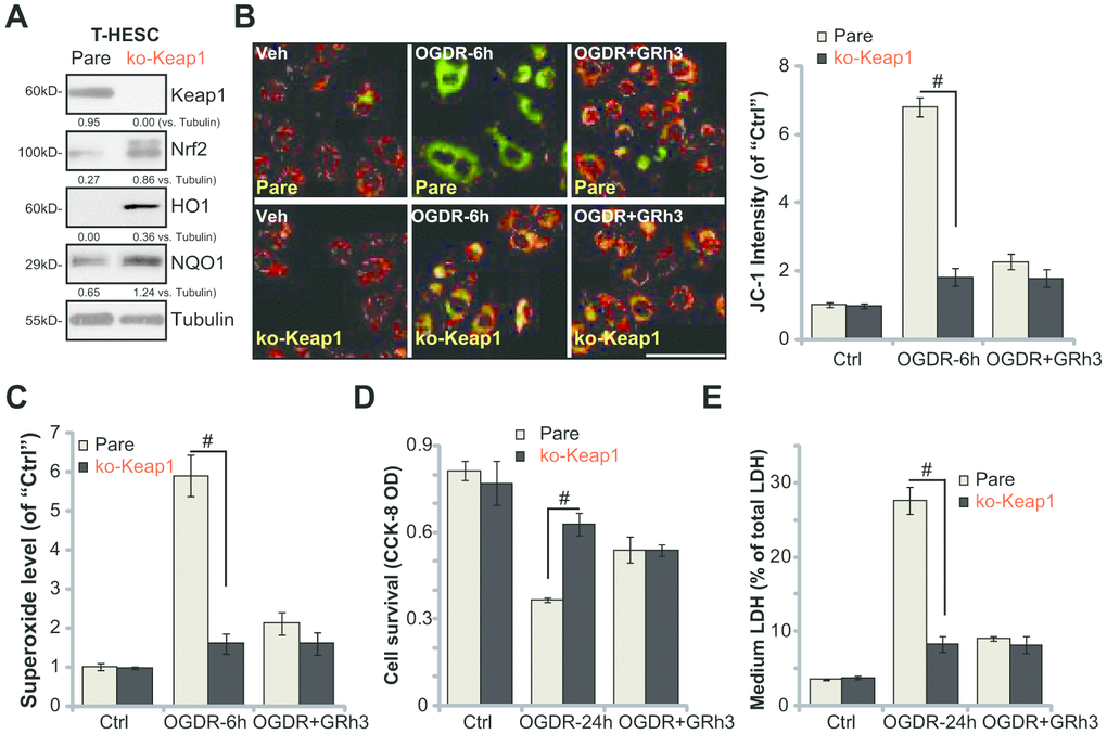 Based on the above results, we hypothesized that forced activation of Nrf2 should protect endometrial cells from OGDR, mimicking GRh3’s activity. In order to test the hypothesis, a lentiviral Keap1 KO construct (provided by Dr. Di [25]) was transduced to T-HESC cells, causing complete Keap1 depletion (“ko-Keap1”, Figure 4A). As expected, in Keap1 KO T-HESC cells, Nrf2 protein was accumulated (Figure 4A). Expression of HO1 and NQO1 was significantly increased (Figure 4A). As shown, OGDR-induced mitochondrial depolarization (JC-1 assay, Figure 4B) and superoxide accumulation (Figure 4C) were largely inhibited in the Keap1 KO cells. Significantly, the Keap1 KO T-HESC cells were protected from OGDR, showing significantly decreased viability reduction (Figure 4D) and cell death (Figure 4E) following OGDR treatment. More importantly, GRh3 treatment failed to further protect the Keap1 KO T-HESC cells from OGDR (Figure 4B–4E). Therefore, GRh3 was ineffective in the Keap1 KO cells, further supporting that activation of Nrf2 is required for GRh3-induced endometrial cell protection against OGDR.