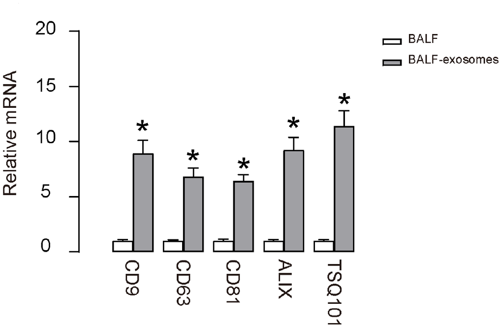 ALI models were applied to mice and BALF were isolated at different time points. Exosomes were then purified from the prepared BALF, confirmed by enriched expression of CD9, CD63, CD81, ALIX and TSQ101 in exosomes, compared to the corresponding total BALF (Figure 1). Hence, exosomes were successfully isolated from ALI-BALF.