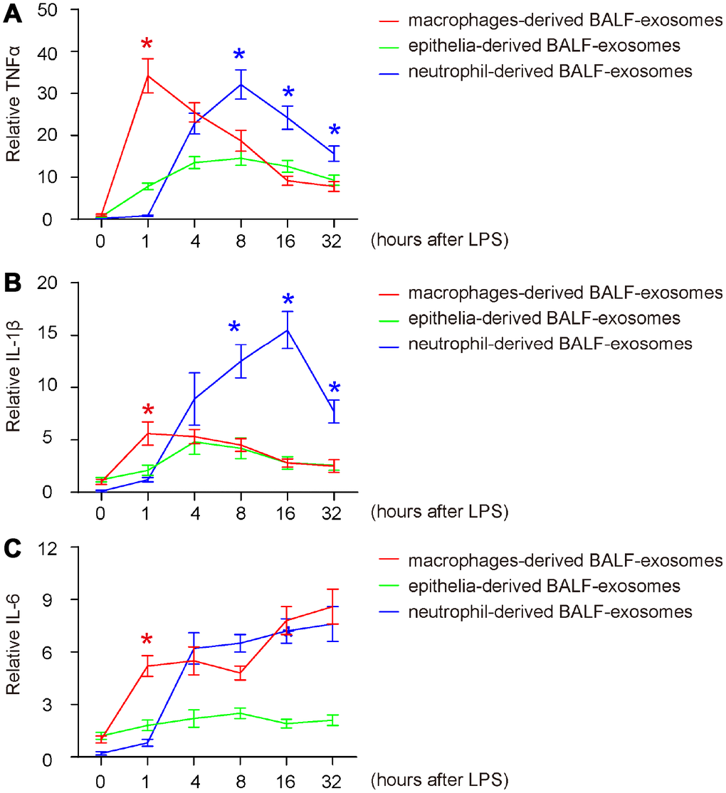 First, we examined the release pattern of three key pro-inflammatory cytokines (TNFα, IL-1β and IL-6) in BALF-exosomes by different cells after ALI. For TNFα, we found that it started to increase in macrophage-derived exosomes as early as 1 hour after ALI, suggesting that the initial responsive cells to LPS should be macrophages, and their prompt release of TNFα suggests that they may be polarized from naïve macrophages to M1 macrophages (Figure 3A). Moreover, this early release of TNFα also appeared to be the peak value by macrophages, since TNFα derived from macrophages continuously decreased afterward (Figure 3A). The TNFα by epithelia appeared to increase from 1 hours after ALI, and likely peaked at 8 hours after ALI, with a relatively slow altering pattern (Figure 3A). On the other hand, The TNFα by neutrophils increased from 4 hours after ALI, but increased dramatically and appeared to be the major source of TNFα after 8 hours post ALI (Figure 3A). Together, these data suggest that LPS may first trigger for M1 polarization of macrophages, which release TNFα to recruit and differentiate neutrophils to further produce and secrete TNFα to mediate the early pro-inflammatory effects after ALI. Similar pattern was detected for IL-1β (Figure 3B), except for that its absolute increase, especially the first phase increase by macrophages, was modest (Figure 3B). The decrease of IL-1β after peak was also less pronounced (Figure 3B), and the peak of the modest increase of IL-1β by epithelia occurred at 4 hours after ALI (Figure 3B). For IL-6, its prompt release by macrophages did not decrease after 1 hour, while the contribution to IL-6 by macrophages and neutrophils was similar after 4 hours (Figure 3C). Thus, the pro-inflammatory cytokines in BALF-exosomes after ALI are derived primary from polarized M1 macrophages at early stage, and from neutrophils at later stages.
