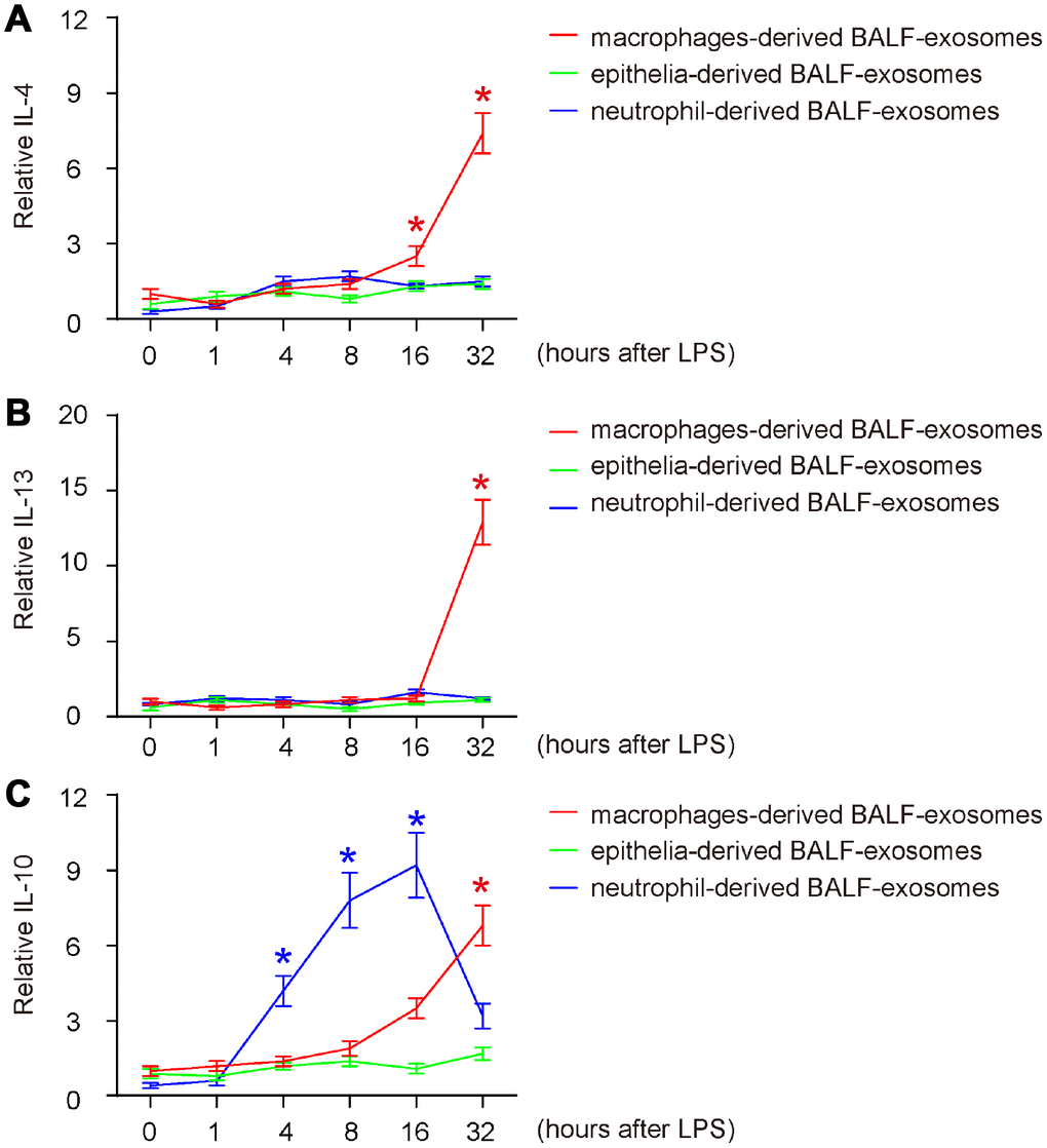 Next, we examined the release pattern of three key anti-inflammatory cytokines (IL-4, IL-13 and IL-10) in BALF-exosomes by different cells after ALI. For IL-4 and IL-13, we detected similar release patterns (Figure 4A, 4B). We found that both IL-4 and IL-13 started to increase at very late stage after ALI (IL-4 as late as 16 hours, and IL-13 as late as 32 hours) and were exclusively released by macrophages (Figure 4A, 4B). These data are consistent with established knowledge that both IL-4 and IL-13 are produced and secreted by T-cells and macrophages, but not by other cell types. The late release of IL-4 and IL-13 by BALF-macrophages suggests that they may be produced and secreted by polarized M2 macrophages, possibly in an autocrine manner to regulate macrophage phenotypic alternation to obtain appropriate functions for tissue repairing. While IL-10 was hardly released by epithelia, the earliest release of IL-10 was detected in BALF-exosomes derived from neutrophils at 4 hours after ALI without decrease till 16 hours (Figure 4C). On the other hand, the earliest release of IL-10 by macrophages appeared at 16 hours after ALI and further increased afterwards (Figure 4C). Since IL-10 is a well-known potent trigger of fibrotic macrophages- M2c, these data suggest that the differentiation of the fibrotic macrophage subtype M2c may be initiated by neutrophils-derived IL-10, and later by IL-10 derived from differentiated macrophages themselves.