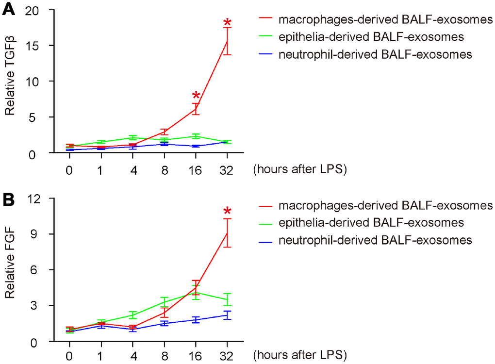 In this study, we used lipopolysaccharide (LPS) to induce ALI in mice and analyzed the exosome population in bronchoalveolar lavage fluid (BALF) from macrophages, neutrophils and epithelial cells at different time points after treatment. Our data showed that macrophages were the major secretors for early secreted pro-inflammatory cytokines in the BALF-exosomes, which likely activated neutrophils to produce a variety of pro-inflammatory cytokines and IL-10. IL-10 by neutrophils in BALF-exosomes likely in turn polarized macrophages to M2c, which may be responsible for post-ALI fibrosis.