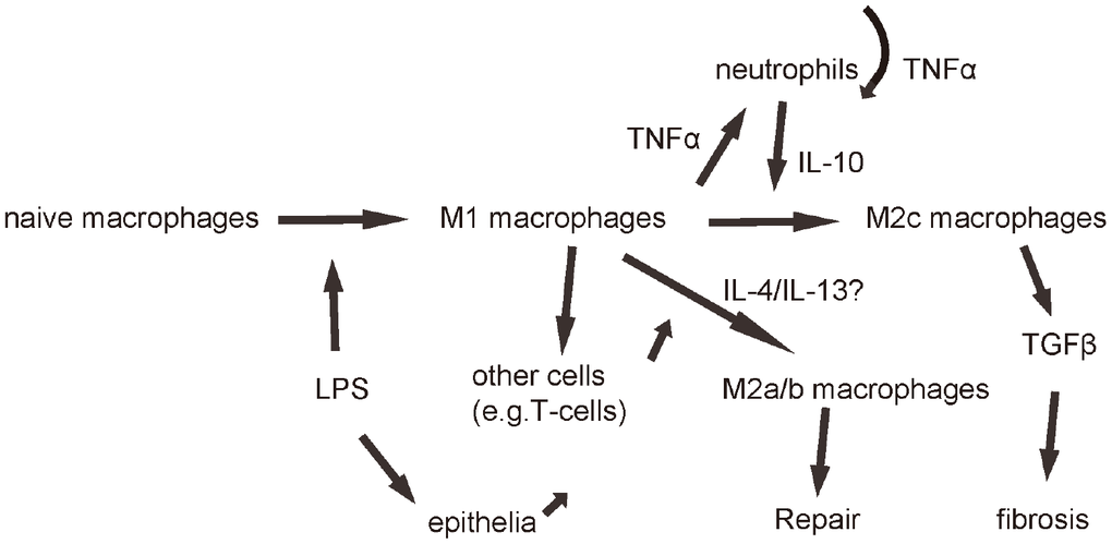 The first interesting finding is TNFα, as it is the most important pro-inflammatory cytokine involved in the early pathogenesis of ALI. The major sources for TNFα are macrophages and neutrophils, while macrophages contribute to most early TNFα, neutrophils secreted most TNFα after 4 hours. Thus, it may be deducted that the early TNFα by macrophages should be secreted by the early macrophages responsive to the ALI-causes, LPS, and should be the trigger for all later responses. It is well-known that TNFα is a M1 macrophage cytokine [18], and thus the release of TNFα from macrophages at 1 hour after ALI should be from newly polarized macrophages, M1. The second wave of TNFα came from neutrophils, and it was clear that these neutrophils were activated later than those M1 macrophages, and were probably just activated by them, and even through TNFα [19].