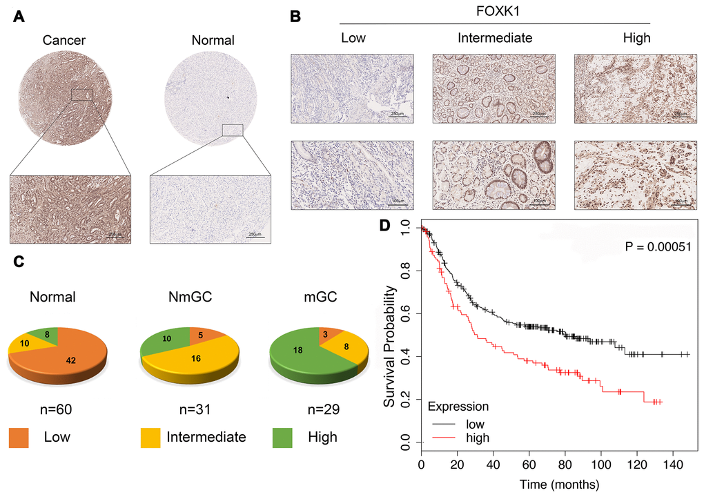 We first verified whether FOXK1 expression is related to GC progression. We analyzed cancerous and adjacent tissues in the Oncomine database and found that FOXK1 was significantly overexpressed in GC in the different datasets (Supplementary Figure 1). To further verify the high expression of FOXK1 in GC, we subjected 60 GC tissues and their adjacent tissues, which included 31 tissues of nonmetastatic gastric cancer (NmGC) and 29 primary metastatic gastric cancer tissues (mGC), to immunohistochemical staining (IHC). Representative images are shown in Figure 1A and 1B. The level of FOXK1 expression in normal tissues adjacent to cancer tissues was significantly lower than that in the cancer tissues. The strongest expression of FOXK1 was found in mGC tissues (Figure 1C). This finding indicates that FOXK1 is highly expressed in GC tissues and is most highly expressed in mGC tissues. A Kaplan-Meier survival analysis revealed that increases in FOXK1 expression were associated with decreased in the patient’s overall survival (OS) (Figure 1D). These results strongly suggest that the upregulation of FOXK1 is closely related to progression and poor prognosis in GC patients.