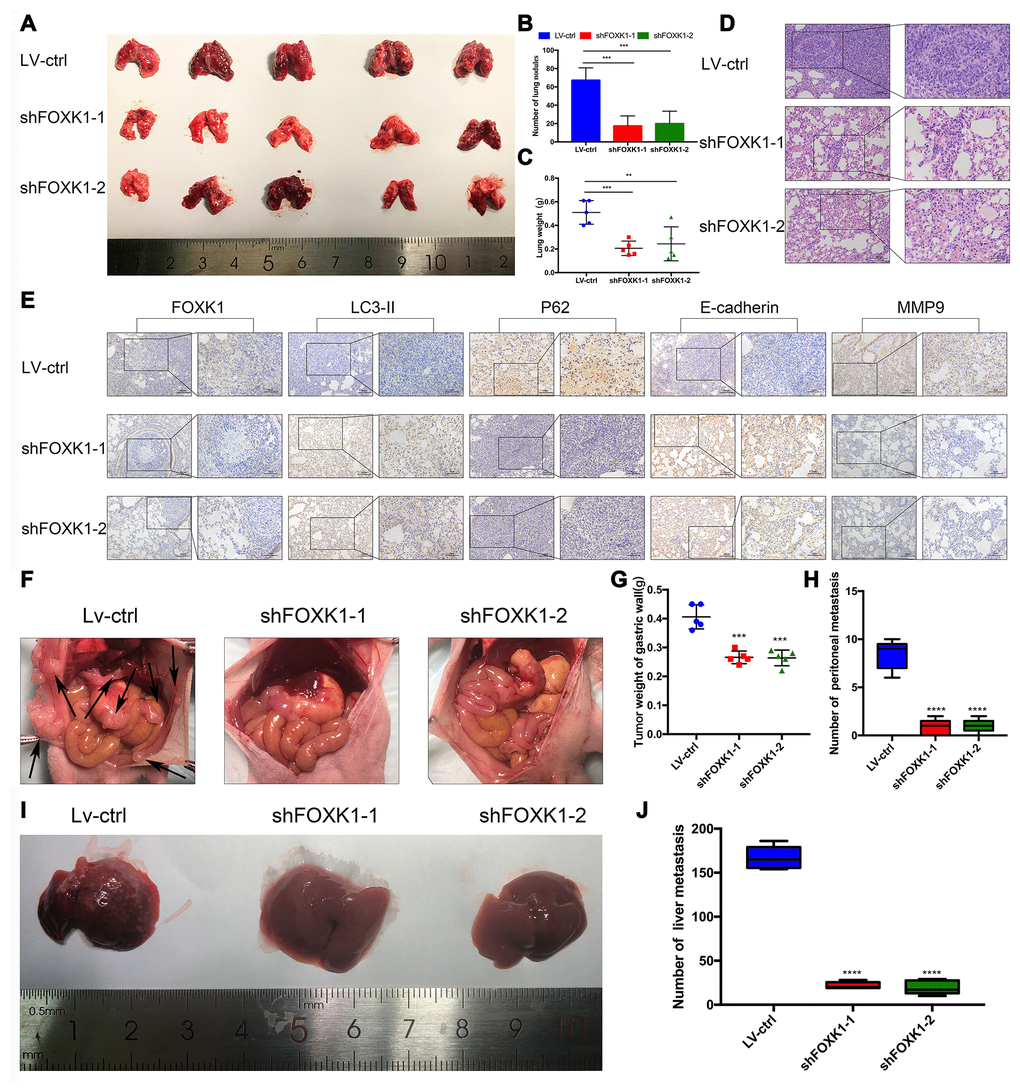To further determine the role of FOXK1 in GC tissues, we assessed whether the silencing of FOXK1 inhibits the lung partialization of diffuse GC cells in vivo and established a mouse tumor model via tail vein injection. As shown in Supplementary Figure 2, we performed Western blotting and qRT-PCR analyses to determine the expression of FOXK1 in GC cells. The expression of FOXK1 was significantly decreased in FOXK1 short hairpin RNA (shRNA)-transfected cells compared with control cells. We transfected MGC803 cells with a lentivirus (LV) encoding shFOXK1-1 and shFOXK1-2. The same number of LV-ctrl, LV-shFOXK1-1 and shFOXK1-2 MGC803 cells were then injected through the tail vein into three groups of 6-week-old BALB/c nude mice. Twenty-eight days after implantation, all the mice were sacrificed, and the metastatic nodules on the surfaces of the lungs were recorded. Significantly reduced lung nodules were found in the LV-shFOXK1-1 and LV-shFOXK1-2 groups compared with the LV-ctrl group (Figure 2A, 2B). In addition, the lung weights of the LV-shFOXK1-1 and LV-shFOXK1-2 groups were less than those of the LV-ctrl group (Figure 2C). Hematoxylin and eosin (H&E) staining also confirmed that the injection of LV-ctrl cells into the tail vein resulted in a significant increase in pulmonary nodules (Figure 2D). In addition, IHC measurements of these metastatic nodules excised from the two groups of mice showed that the silencing of FOXK1 increased the expression of LC3-II and E-cadherin and decreased the expression of P62 and MMP9 compared with the expression levels observed in the control nodules (Figure 2E). These results show that FOXK1 silencing significantly inhibits GC lung metastasis.