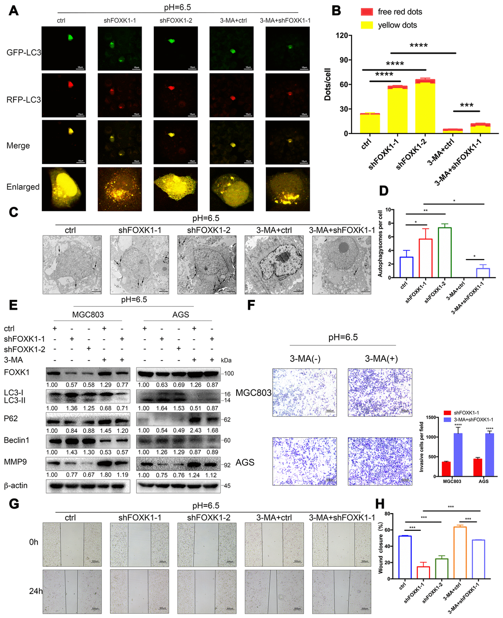 A previous study showed that the FOXK1 and SIN3A complexes inhibit the basal levels of autophagy [32], the association between FOXK1 and autophagy under acidic conditions has not been reported. To elucidate the effect of the inhibition of FOXK1 on autophagic flux, we observed MGC803 cells transiently infected with the adenovirus mRFP-GFP-LC3 under a laser scanning confocal microscope. In this system, the GFP-mRFP-LC3 reporter localized as yellow puncta in autophagosomes and red-only puncta in autolysosomes because the acidic lysosomal environment induces the decay of GFP fluorescence but maintains the red fluorescence of mRFP [33]. As shown in Figure 4A, the MGC803 cells belonging to the control group and transfected with mRFP-GFP-LC3 exhibited the basal levels of autophagy, and the knockout of FOXK1 expression significantly increased the number of red-only LC3 puncta, which indicates an increase in autophagic flux (Figure 4A, 4B). By transmission electron microscopy, we found that autophagosomes infected with shFOXK1-1 and shFOXK1-2 were significantly more autophagic than those belonging to the control group (Figure 4C, 4D). Western blotting further confirmed that the silencing of FOXK1 in MGC803 and AGS cells increased the levels of LC3-II and Beclin1 proteins and decreased the levels of P62 proteins (Figure 4E). The above results indicate that the inhibition of FOXK1 significantly induces autophagy in GC cells at pH 6.5. We subsequently investigated the role of FOXK1-induced autophagy inhibition in GC metastasis. As expected, laser confocal microscopy showed that treatment with the autophagy inhibitor 3-methyladenine (3-MA) significantly reduced the number of red-only LC3 puncta (Figure 4A, 4B). The production of autophagosomes was also reduced, as demonstrated by transmission electron microscopy (Figure 4C, 4D). A Western blotting analysis also showed that 3-MA treatment decreased LC3-II and Beclin1 protein expression, and increased P62 protein expression. (Figure 4E). In addition, cell scratch and transwell experiments confirmed that the inhibition of autophagy by 3-MA antagonized the inhibitory effect of the knockout of FOXK1 on the migration and invasion of GC cells (Figure 4F–4H). Further Western blotting results confirmed that the expression of MMP9 increased after treatment with 3-MA. Together, these results indicate that the inhibition of FOXK1 expression induces autophagy to inhibit migration and invasion.