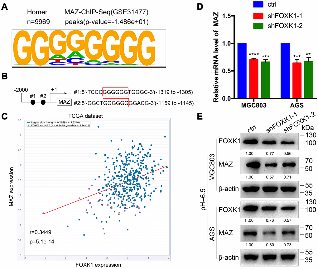 To further decipher the molecular mechanism through which the silencing of FOXK1-induced autophagy promotes GC cell migration and invasion, we sought to identify the direct target of FOXK1 by analyzing the DNA-binding region of endogenous FOXK1 through chromatin immunoprecipitation sequencing (ChIP-seq) using a substantive antibody against FOXK1. As shown in Figure 5A, MAZ exhibited the best match to the consensus GGGGGG motif (E value = -1.486e + 01). Moreover, a bioinformatics analysis demonstrated that two binding sites for MAZ might exist in the 5’-untranslated region (UTR) of FOXK1 (Figure 5B). In addition, the coexpression of FOXK1 and MAZ was analyzed by querying the open database ChIPBase v2.0 in The Cancer Genome Atlas (TCGA) GC dataset. The results showed that FOXK1 was positively correlated with the MAZ gene in GC (r: 0.3449, p = 5.1e-14) (Figure 5C). Based on the bioinformatics results, we performed q-PCR and Western blotting analyses to determine whether FOXK1 exerts an effect on the expression of MAZ in human GC. The forced silencing of FOXK1 led to decreases in MAZ mRNA and protein expression (Figure 5D, 5E). In summary, the above-described experimental results indicate that FOXK1 can activate its transcription by binding to the MAZ promoter.